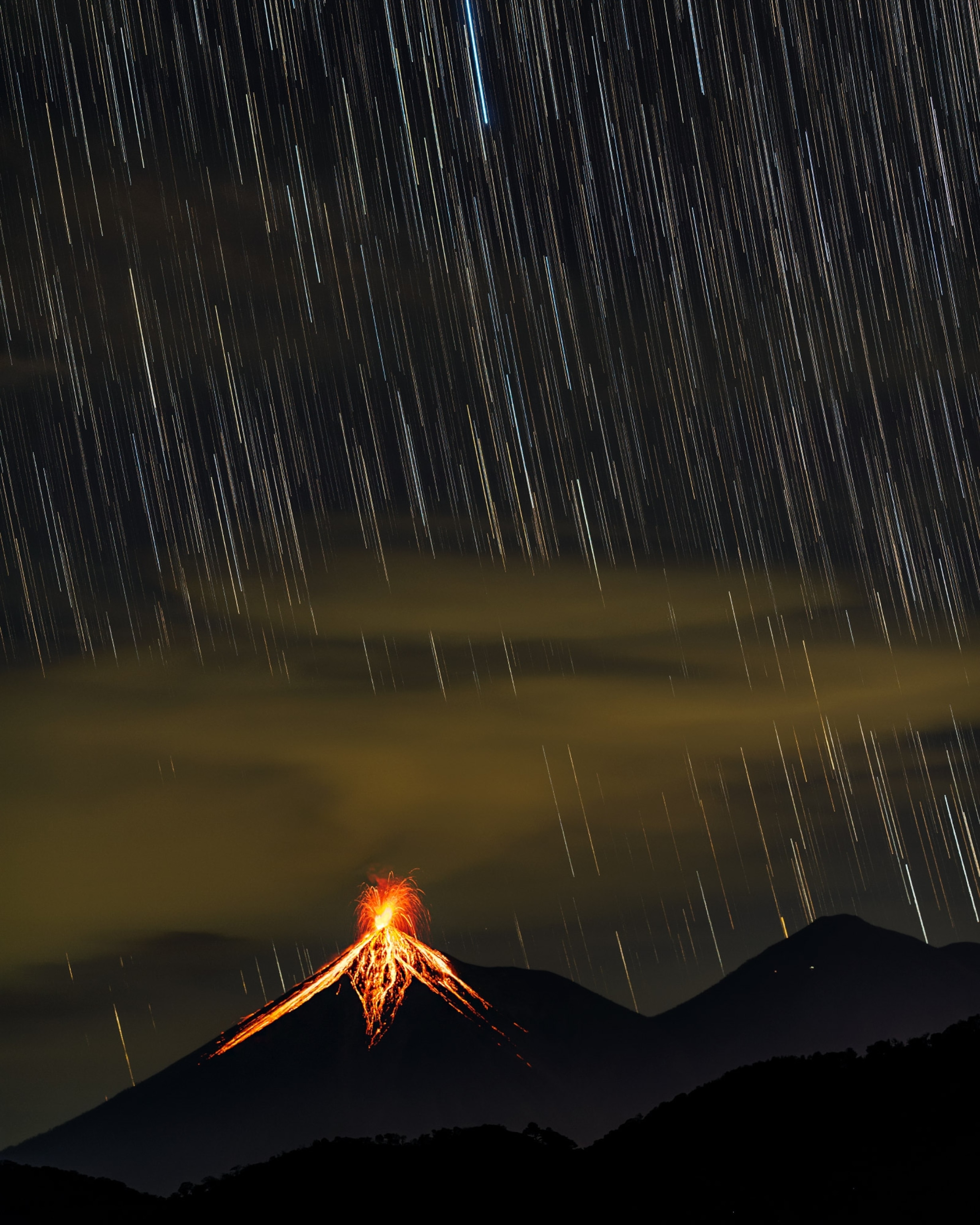 Raining stars? Due to Earth's rotation, stars appear to rain down on the Volcán de Fuego (fire volcano) in Guatemala. The long exposure is the result of a timelapse sequence. On this November 2019 night, photographer Babak Tafreshi recorded an average of 10 explosions an hour above the volcano's summit. The volcano has been continuously active since a catastrophic eruption on June 3, 2018, that killed hundreds of people and affected nearly two million. Avalanches of hot gas and debris called pyroclastic flows raced down the mountain, engulfing whole villages at the bottom, Tafreshi said.