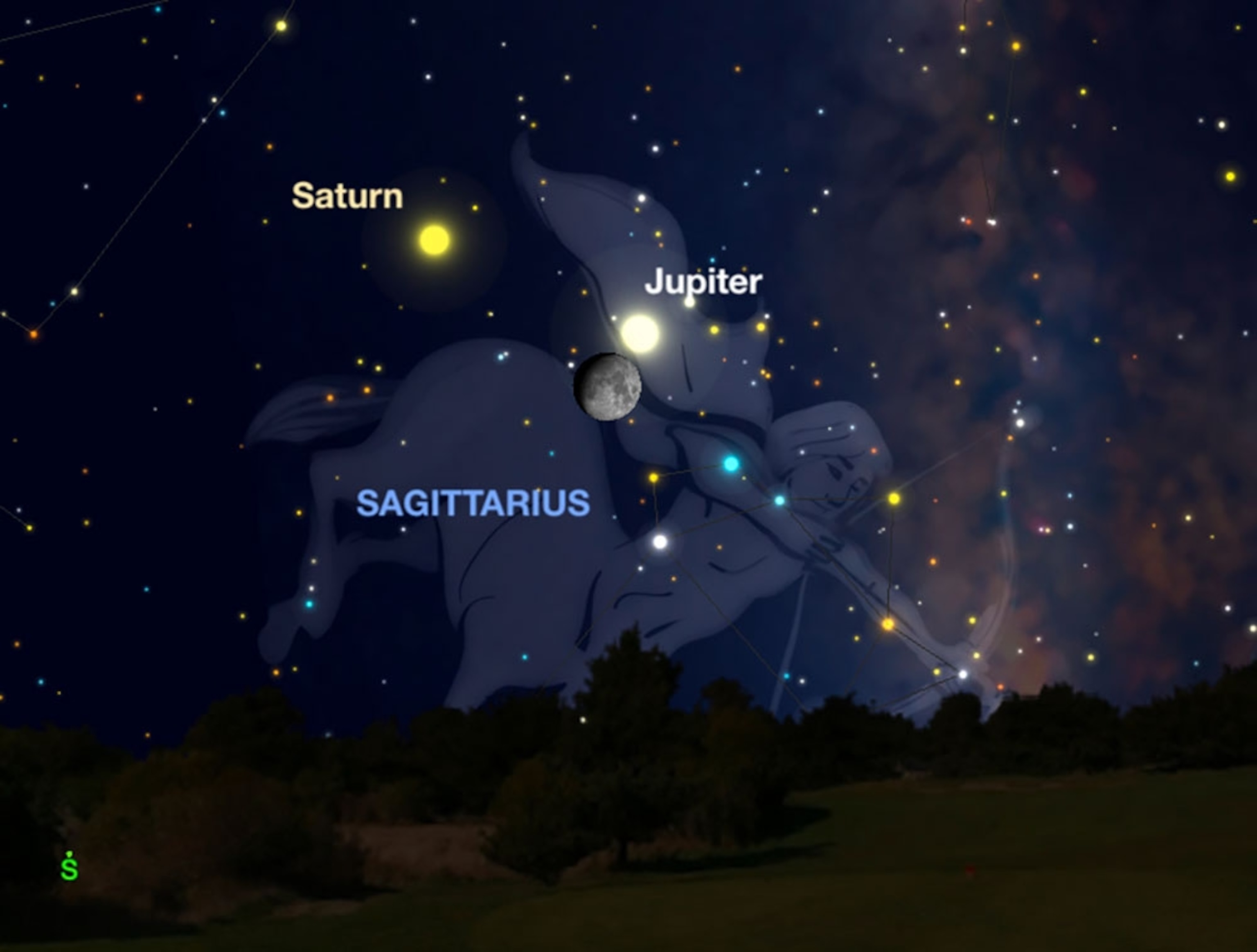 Planets take aim at the archer: This week, look for the moon to pose with two of the solar system’s largest planets in the constellation Sagittarius. On Friday night, the waxing gibbous moon and Jupiter will appear within the constellation as it sits above the southern horizon. Binoculars will reveal Jupiter’s four largest moons. By Saturday evening, the moon will slide over to join Saturn, and a small telescope will show off that planet’s famous rings. The dwarf planet Ceres will reach opposition Friday, too, meaning it will be at its brightest this year. Ceres, which orbits between Mars and Jupiter, has been traditionally thought of as the largest asteroid in the inner solar system, yet it is only 6 percent as wide as Earth. With binoculars, you will be able to see Ceres gliding silently through the faint stars of Aquarius, halfway between the planets Mars and Saturn. — Andrew Fazekas
