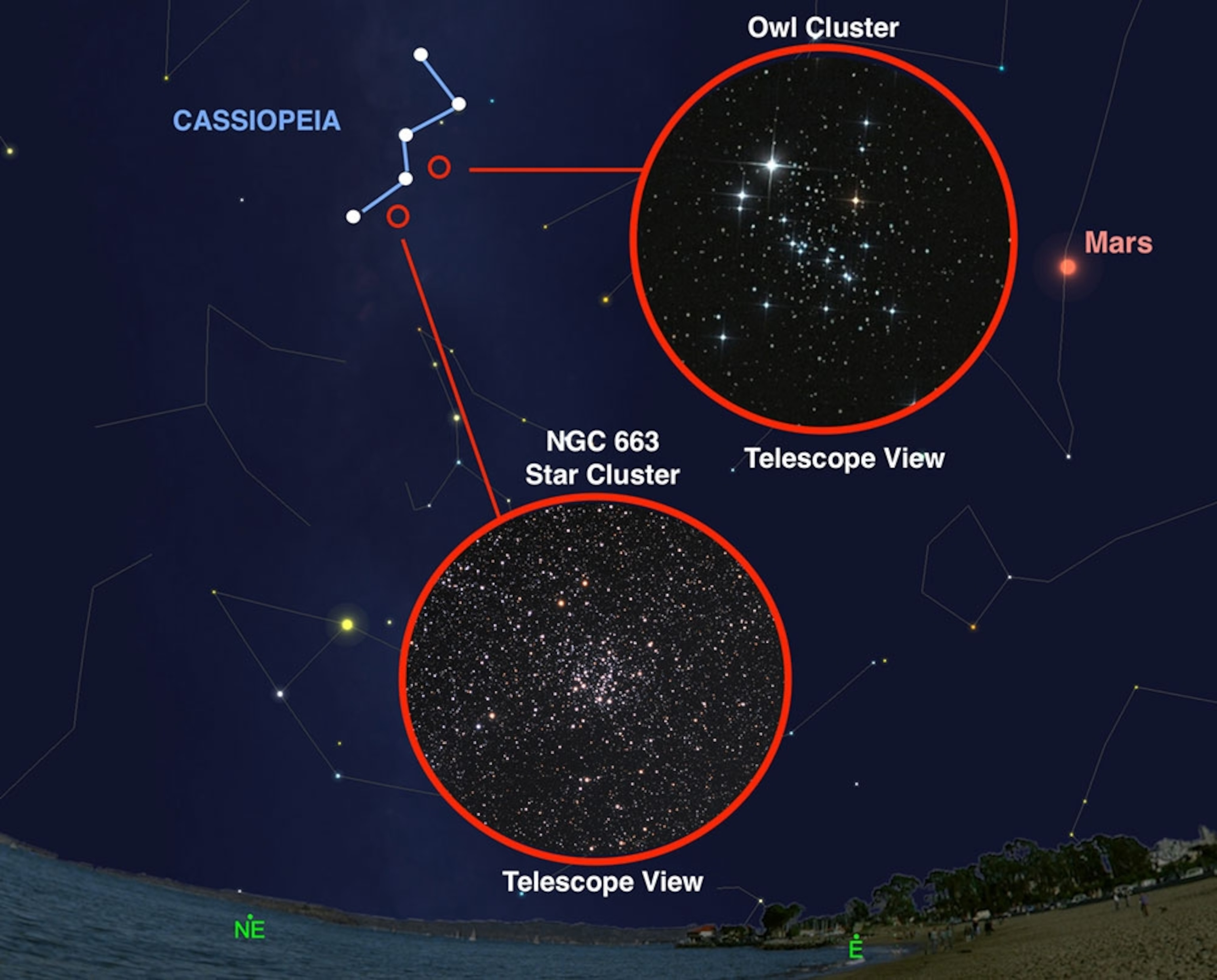 The W: On the next clear night, take a tour of a group of stars that form a large lopsided W high above the northeastern horizon. That’s the constellation Cassiopeia. Its five most visible stars shine with similar brightness, but their distance varies greatly, with the star Caph only 54 light-years away while Gamma Cassiopeiae sits 650 light-years from Earth. Cassiopeia is also home to two jewel-like open star clusters easily visible with binoculars. The easiest to pick out is NGC 663, but look near the bright star Ruchbahm and you can also glimpse the majestic Owl Cluster, a swarm of 200 newborn stars over 9,000 light-years away. And before dawn on Monday, sky-watchers in the Southern Hemisphere can see a handful of shooting stars an hour during the minor Puppid-Velid meteor shower. — Andrew Fazekas