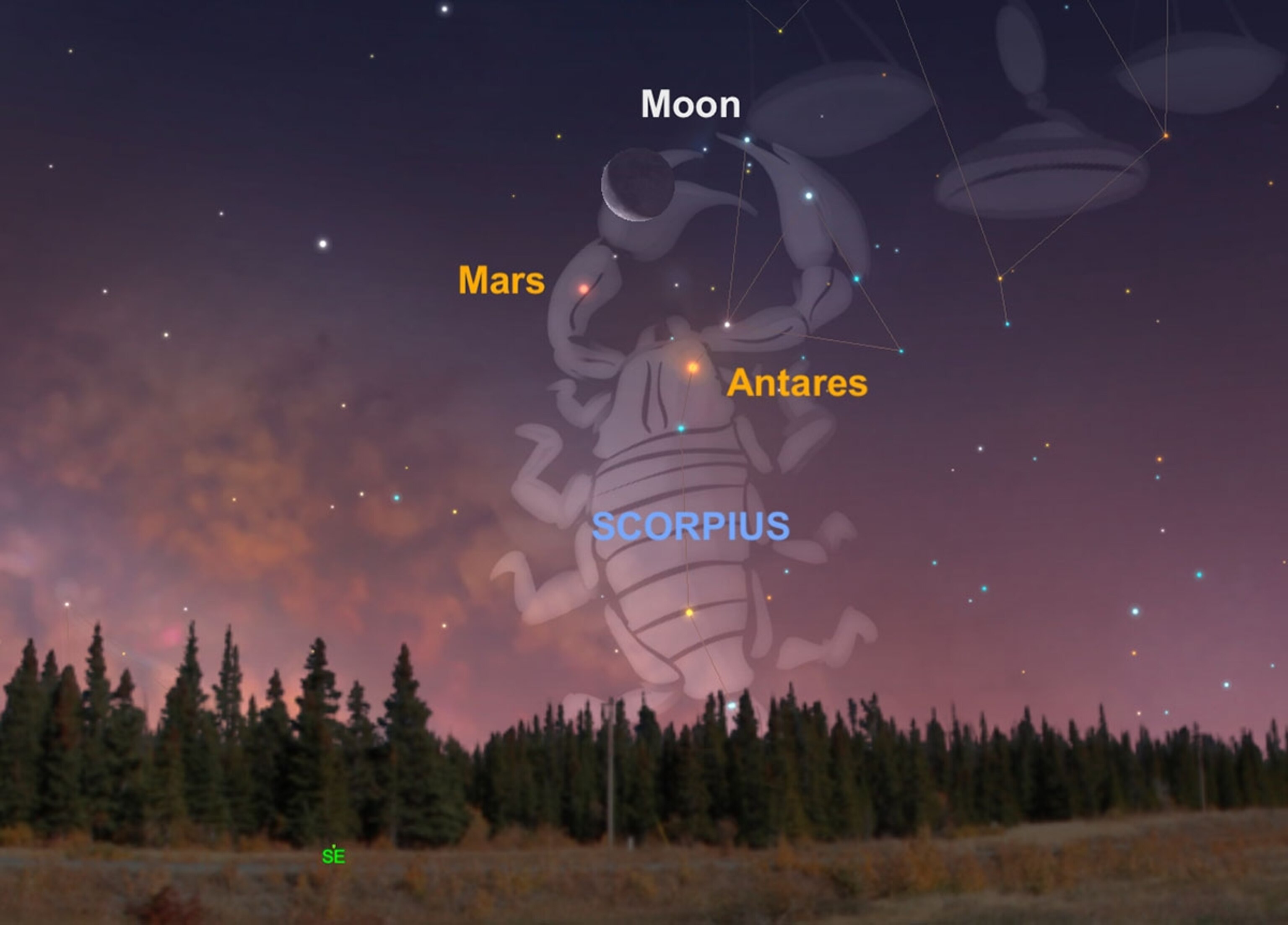 Mars meets its rival: Look toward the southeast right before dawn Saturday and notice two bright orange-colored stars burning together in the sky. The slightly brighter of the two is actually the planet Mars, and the other was named by the ancient Greeks as Antares—the rival of Mars. The red planet is currently 17 light-minutes away and is about a third of Earth’s size, while Antares is 604 light-years away and is so large that if it replaced our sun, it would extend to the orbit of Mars. Check the same celestial real estate Monday for the waning crescent moon to join Mars and Antares in the constellation Scorpius, the scorpion.—Andrew Fazekas