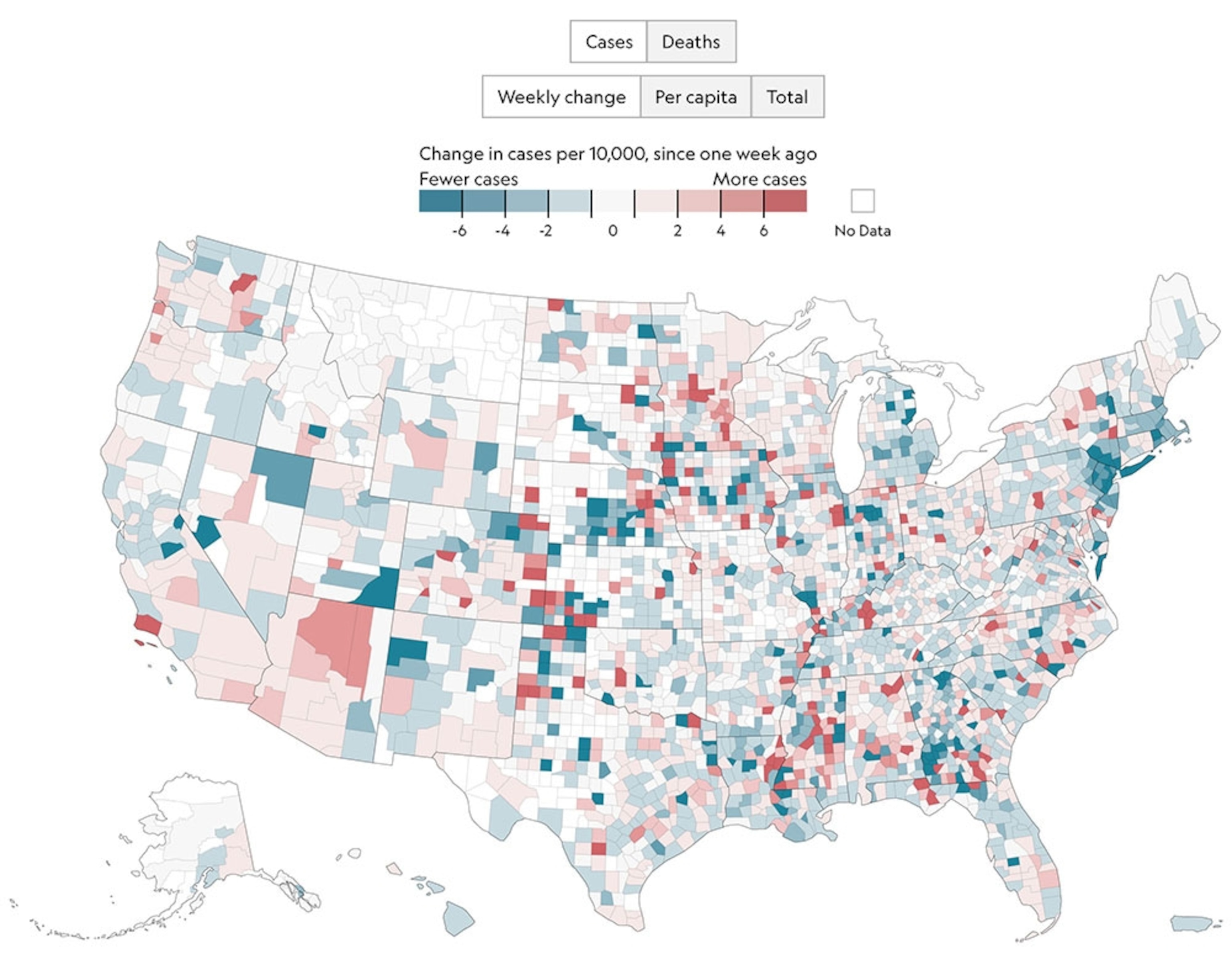 Just the facts: Nat Geo has launched a coronavirus tracker to show what parts of the United States have increasing and decreasing cases of COVID-19 reported week by week. There is state-by-state and county-by-county data, with shades of blue marking a weekly decline, and red marking an increase. Figures are updated daily. Maps show how the United States is maintaining a peak of about 25,000 cases a day. The maps show numbers falling in several areas that were epicenters, but rises elsewhere to keep the overall tally steady.