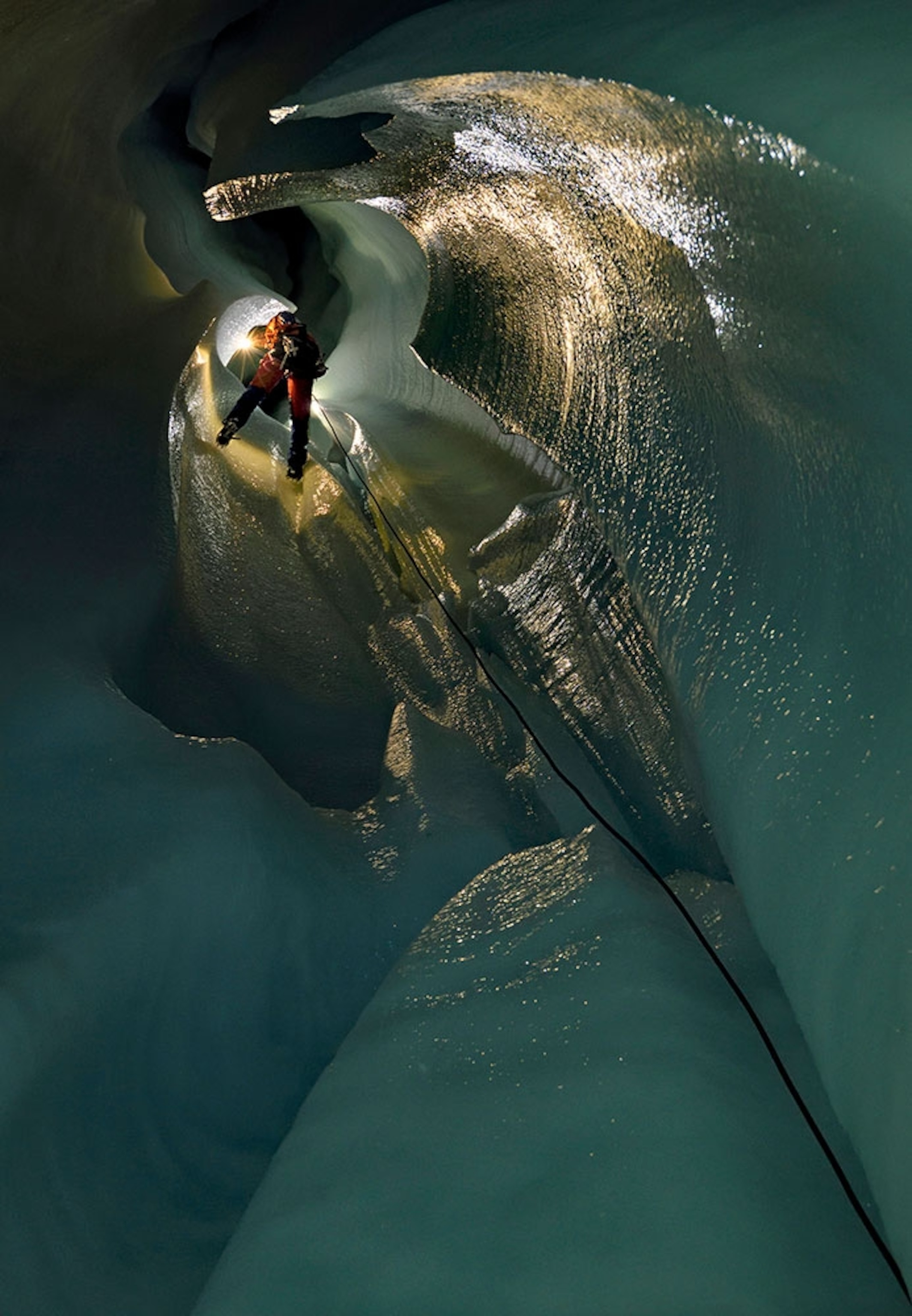 Before it melts: Photographer Robbie Shone has explored the world’s glaciers for years. Here, Shone captures a glaciologist descending a moulin (glacier cave) on the Gorner glacier in Switzerland in search of answers to their questions about climate change.