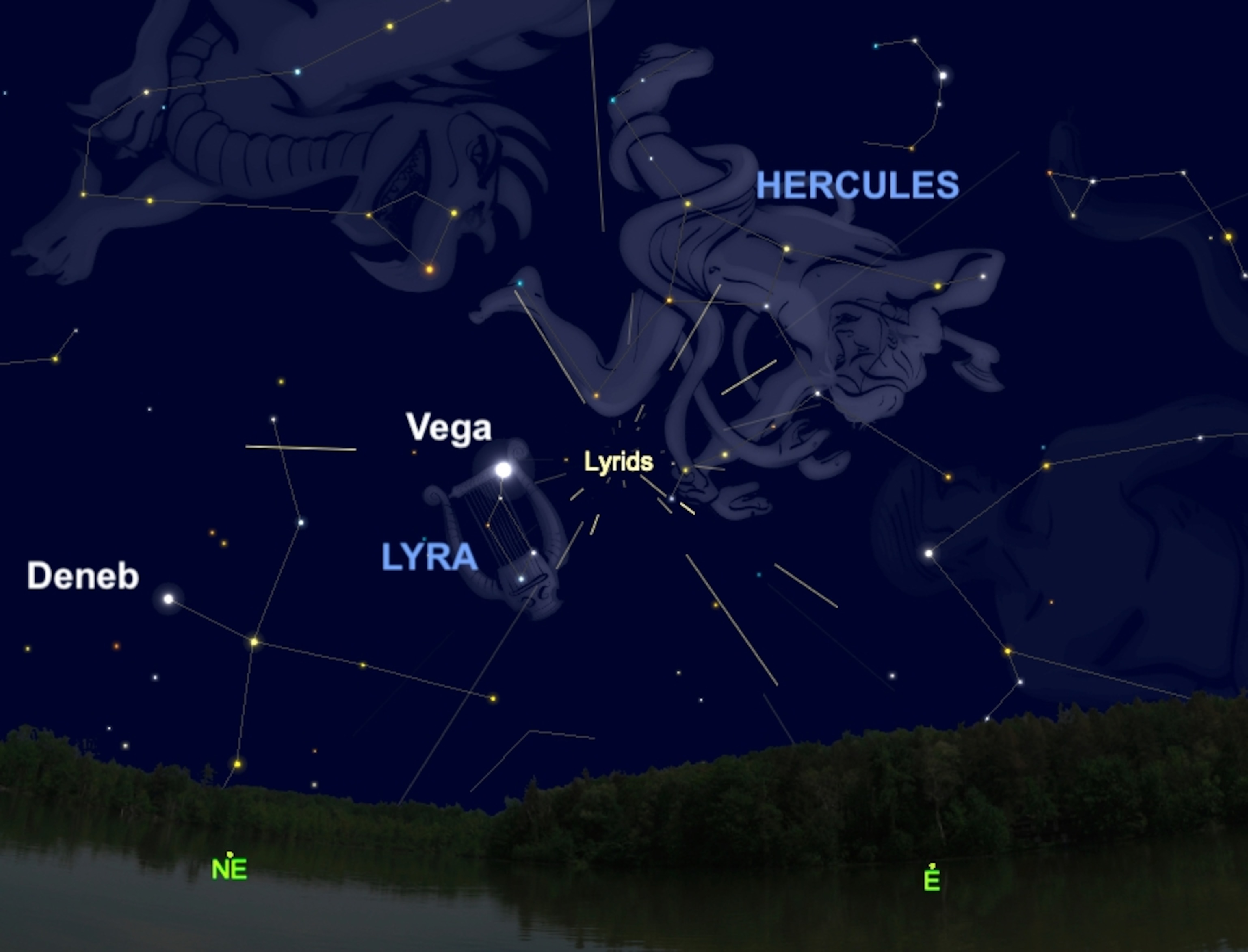 Heavenly harp meteor shower: Tonight, sky-watchers can enjoy the annual Lyrid meteor shower, named after the constellation Lyra, the harp. With the moon out of the overnight sky, dark conditions should let observers see anywhere from 10 to 25 shooting stars an hour, depending on if you view the celestial fireworks from a city suburb or dark countryside. The Lyrids are also known to have surprise outbursts, such as in 1982, when as many as 250 meteors raced by in a single hour. Individual meteors will appear to radiate from the region around the star Vega, which currently shines nearly overhead just before dawn. On Sunday, don’t miss a sunset meeting between the crescent moon and super-bright Venus.—Andrew Fazekas