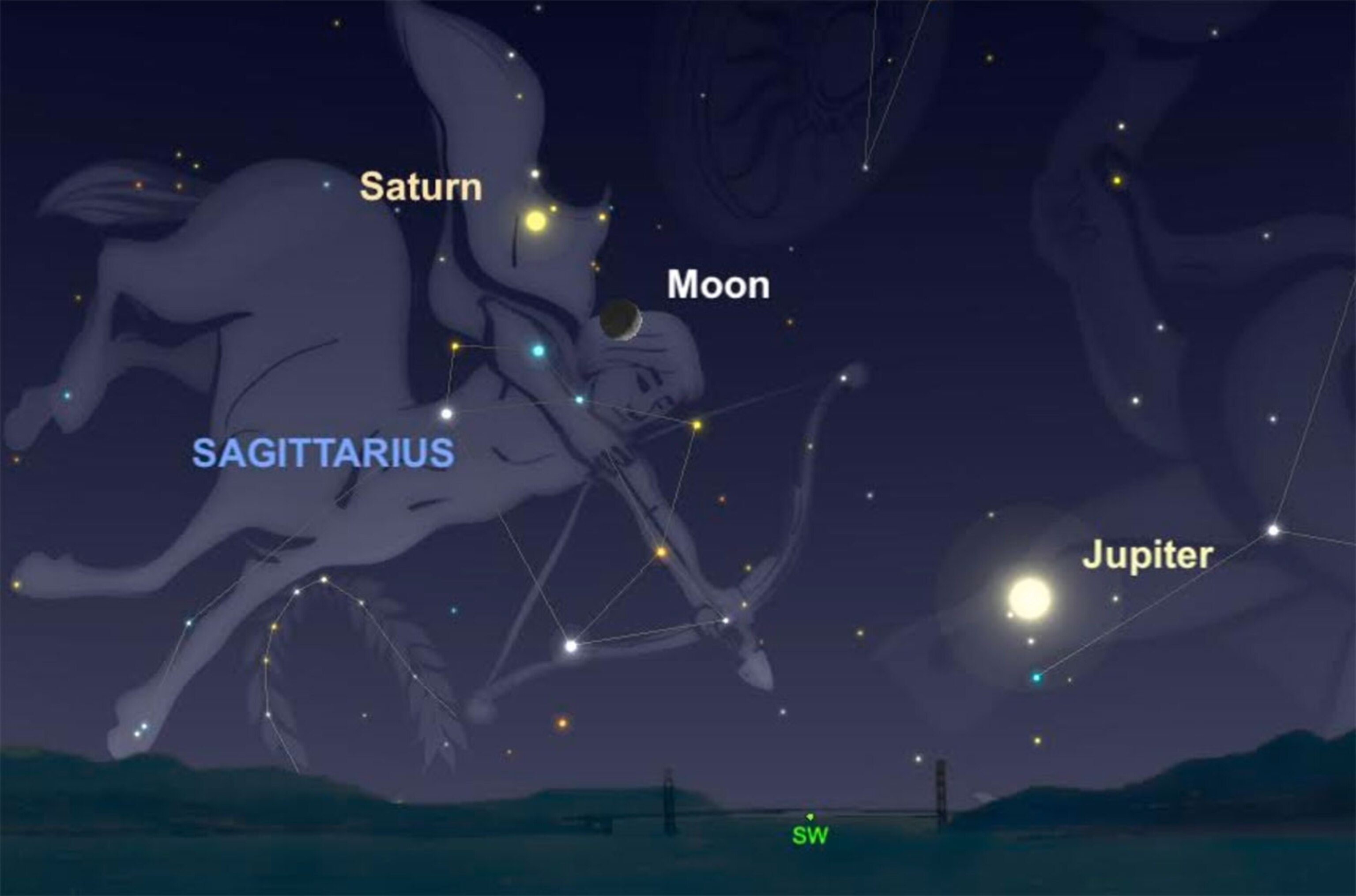 Moons of Jupiter. Gaze toward the low southwest on Halloween night and on Friday night, and catch sight of the waxing crescent moon paying visits with Jupiter and Saturn. Both planets are shining like brilliant, creamy-colored stars and amazing targets for small telescopes, showing off atmospheric details and their largest moons. Even steadily held binoculars will showcase the four largest moons of Jupiter, appearing like a line of dots on either side of the planet. While the moon is only 1.3 light minutes away, sunlight reflecting off the cloud tops of Jupiter takes 49 minutes to reach your eyes. Saturn is so far away that it takes nearly 86 minutes for its light to travel to Earth. —Andrew Fazekas