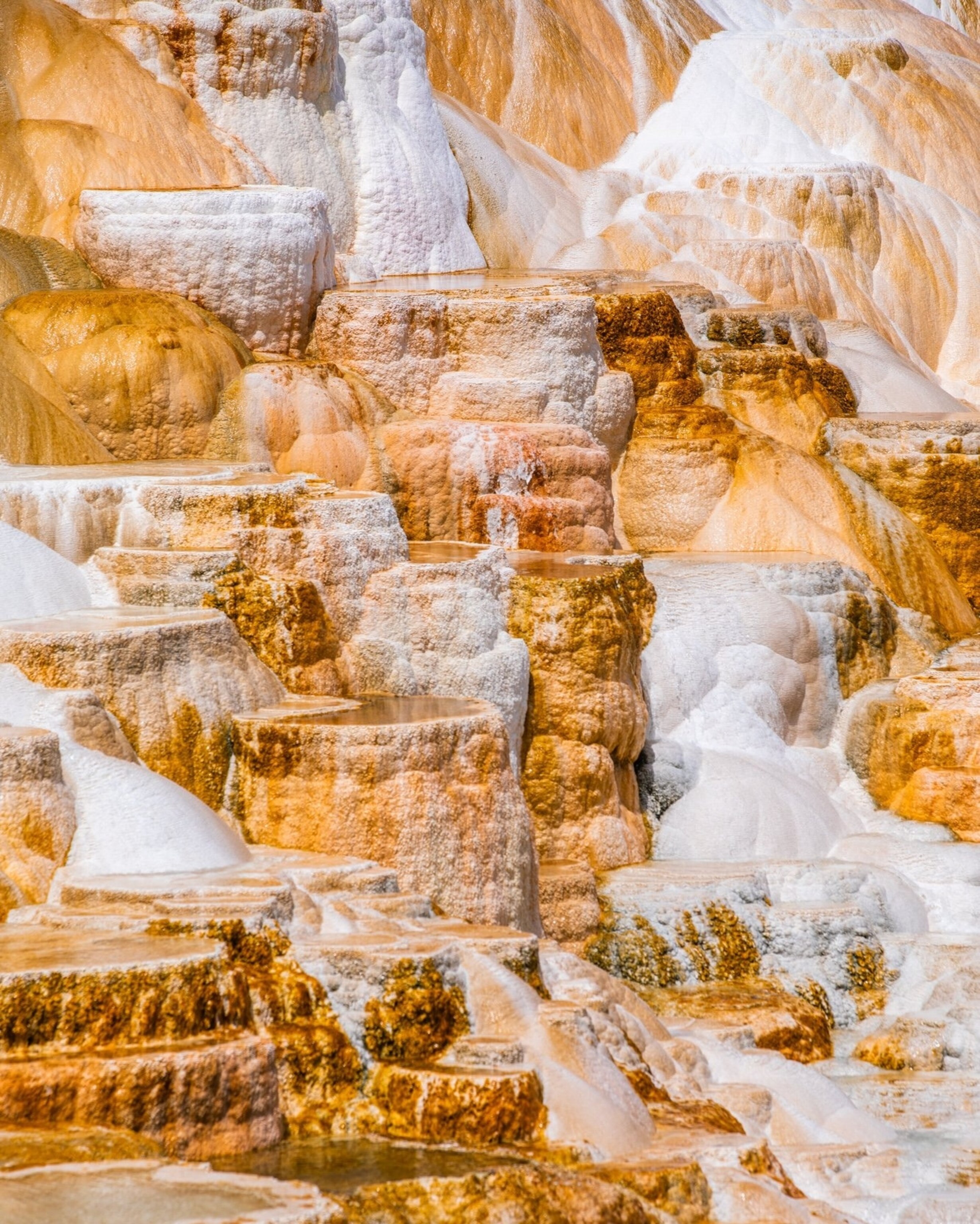 Bright and steamy: Hot water trickles down Mammoth Hot Springs in Yellowstone National Park. The area consists of about a hundred hot springs that are scattered on a hillside with stepped travertine terraces. Travertine is a form of limestone deposited by mineral springs. Says photographer Sofia Jaramillo: “This is one of my favorite places to explore in the park because of the incredible views of the brightly colored pools.”
