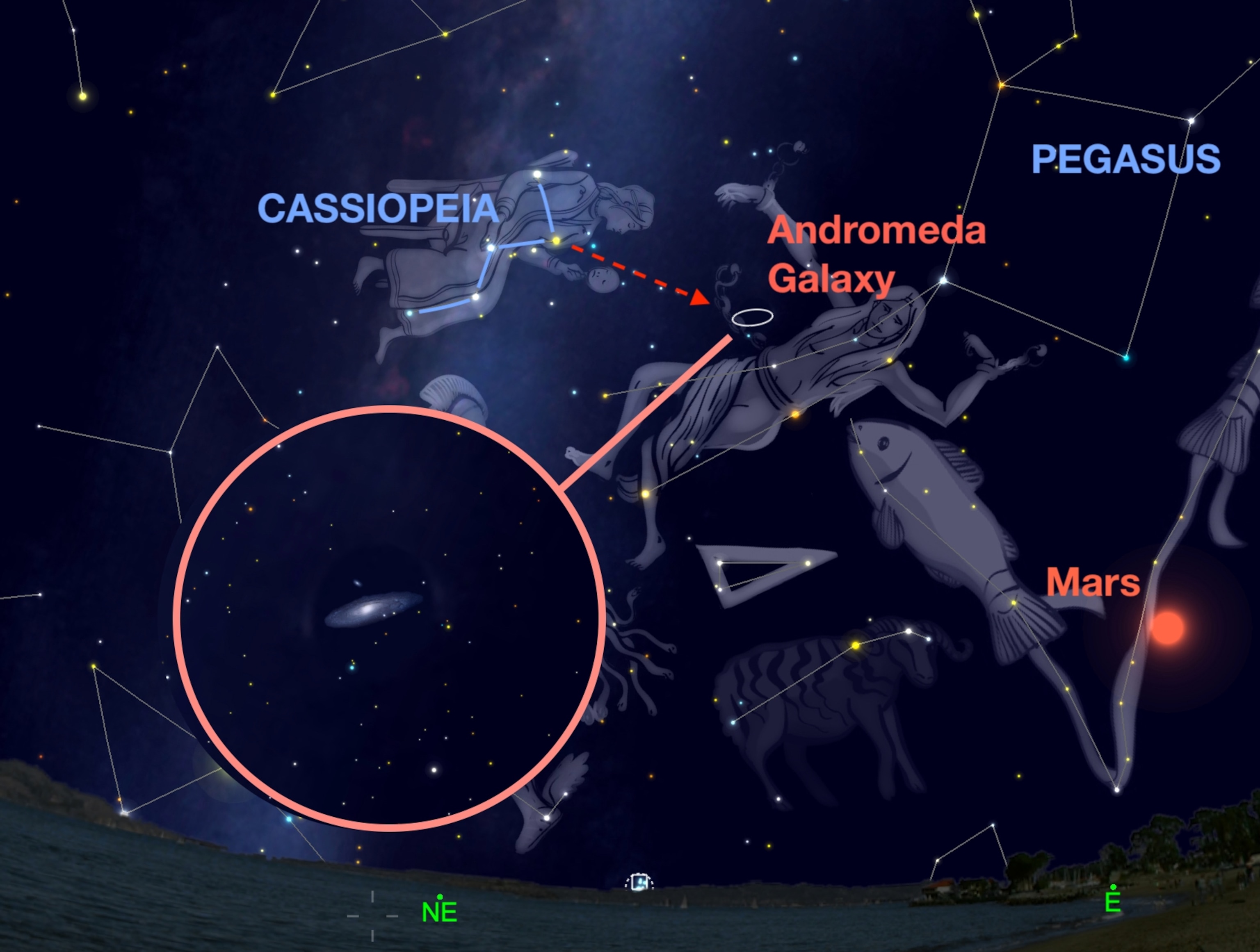 A galaxy far, far away: With moonless nights this week, sky-watchers can hunt for the most distant object our eye can see: the Andromeda Galaxy. Though it is 2.7 million light-years away, Andromeda is the closest neighboring large galaxy to our Milky Way. And it can be found in its namesake constellation, visible in the evening when it is rising in the east. Start your search by finding the bright constellation Cassiopeia, shaped like a lopsided W. Use the right-side of the W as an arrow pointing downward to find the faint blob that marks the bright core of Andromeda. Binoculars and small telescopes will easily unveil the galaxy’s spindle shape, which spans 150,000 light-years across. —Andrew Fazekas
