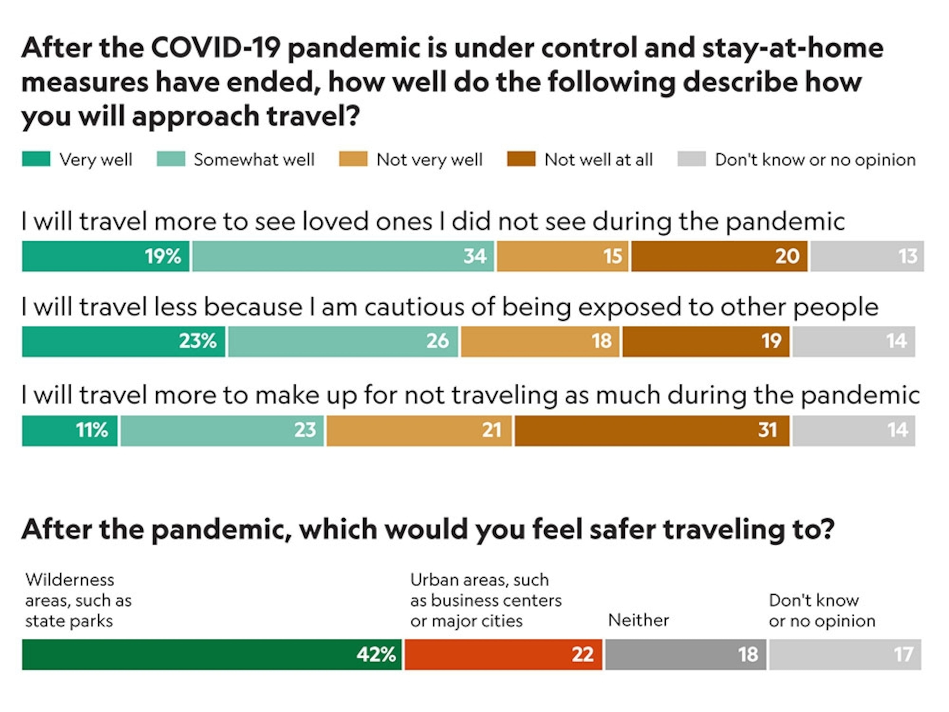 Where to travel? Considering future travels, the poll found that Americans would feel safer traveling to wilderness areas, such as state parks (42%) compared to urban areas (22%). Curiously, people age 35–44 favored urban areas, but all other age groups opted for the wilderness. Americans also consider familiar places, such as destinations they have traveled before or which regularly host tourists (47%) safer than unfamiliar places, such as off-the-beaten path or remote destinations (19%). Men responded by a 7% margin over women that they would feel safer in familiar places. Based on income, more affluent respondents were even more likely to opt for familiar places over remote destinations.