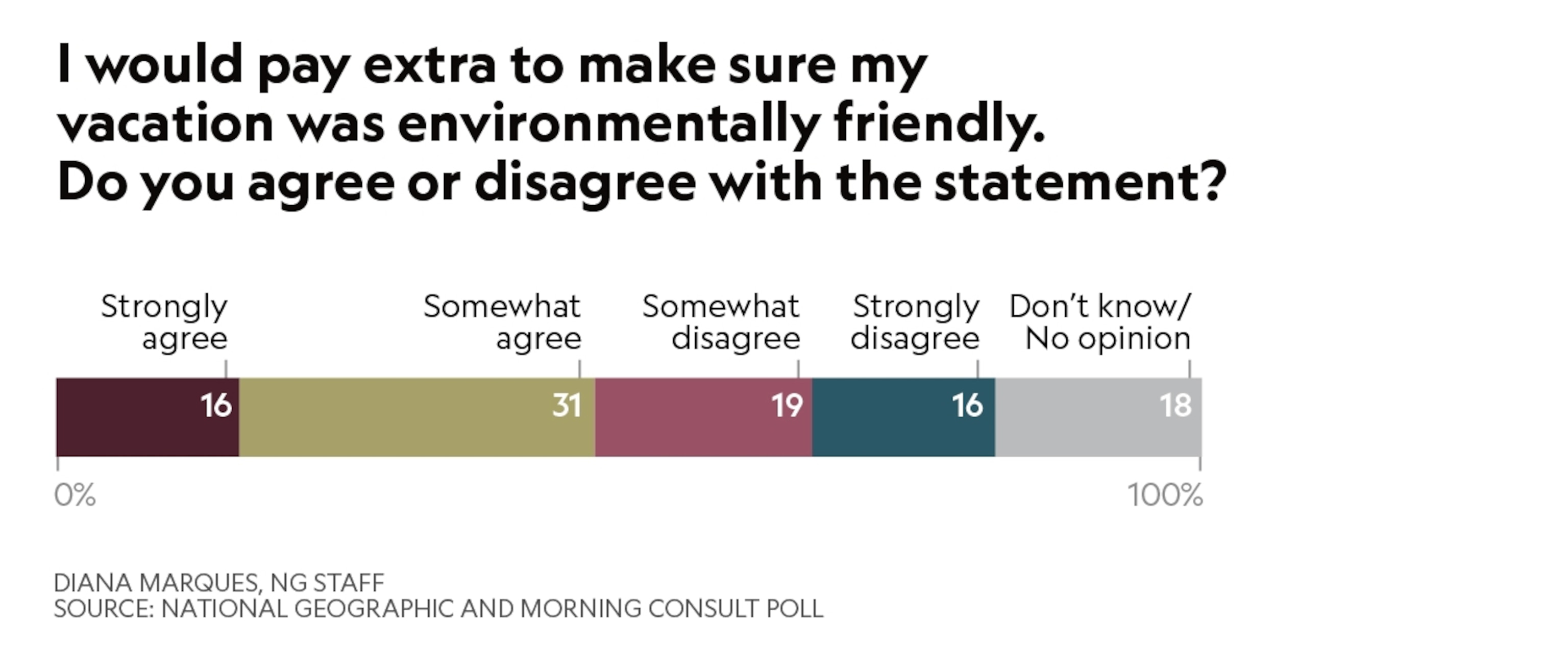 Would you pay more for a more sustainable vacation? Travelers are now considering this question and others (including their own carbon emissions) before choosing their next trip. In a National Geographic survey, consumers most familiar with sustainable travel are young: 50 percent are 18 to 34. A just-released National Geographic and Morning Consult poll says 47 percent of Americans would pay more for an environmentally friendly vacation (see chart below). The decisions these travelers make could radically alter the topography of tourism. Armed with the right information, their choices could improve the world for tomorrow’s travelers.