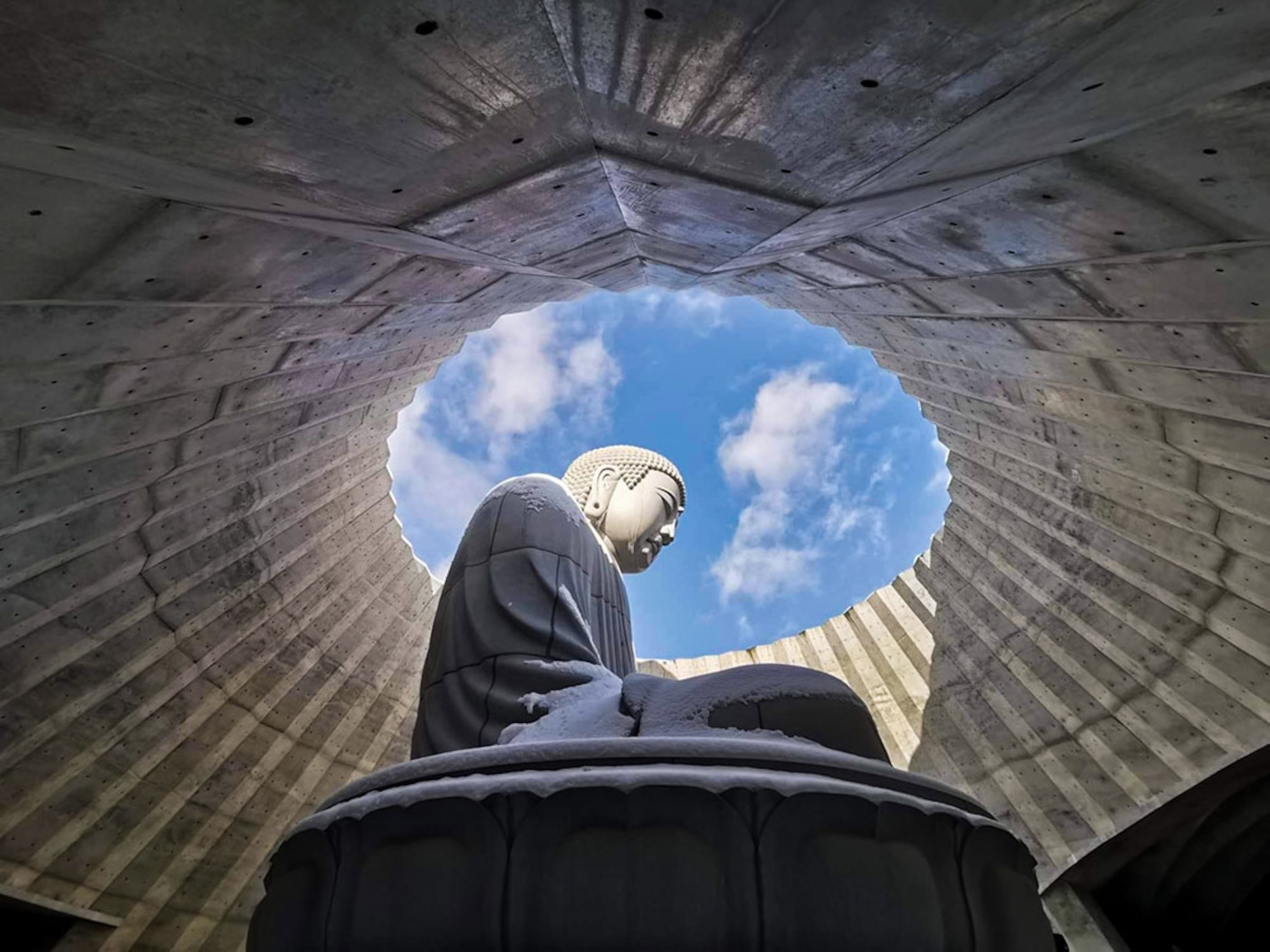 Big: An enormous Buddha statue pokes the top of its head from a cavernous concrete structure at the Makomanai Takino Cemetery in Sapporo, Japan. Atama Daibutsu, or the Buddha's Head, stands at 44 feet and was designed by Japanese architect Tadao Ando. In colder months, icicles hang from the chin and snow sits on the top of the head; warmer seasons reveal 150,000 bushes of lavender circling the dome around the statue.