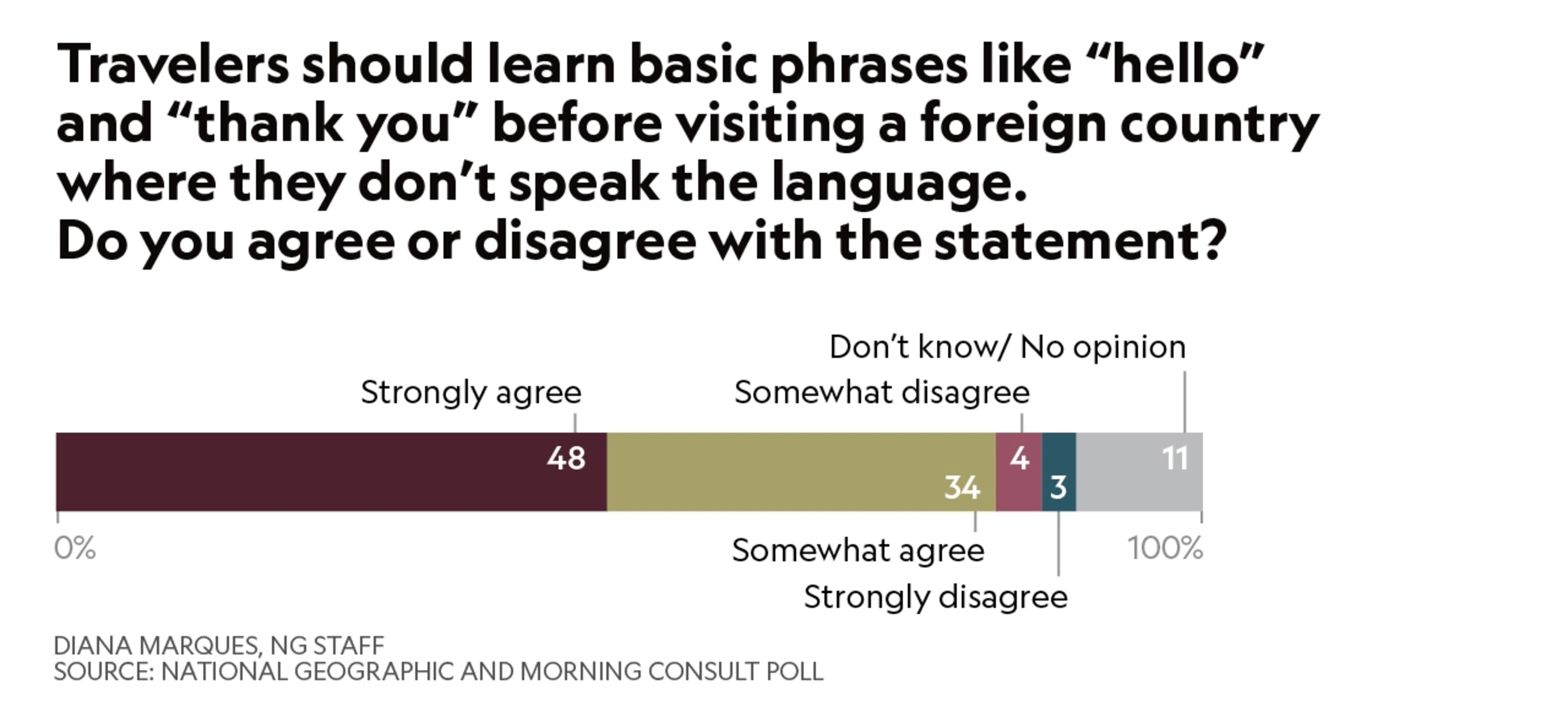 The days of English-is-good-enough-anywhere American tourists appear to be over, at least according to a National Geographic and Morning Consult poll of 2,200 Americans. More than 8 in 10 Americans polled said travelers should learn basic phrases before going to a foreign-speaking land. Only 7 percent disagreed. Here’s the breakdown:
