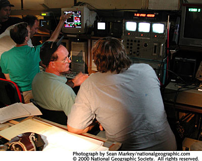 Robert Ballard and team members carefully scan the monitors in the remotely operated vehicle (ROV) control room aboard the expedition ship