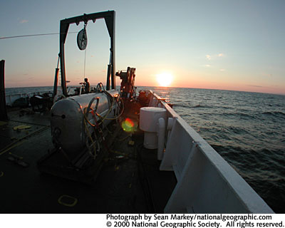 A sonar-equipped ROV waits on deck for its next assignment. The ROV uses sound waves to identify potential search targets.