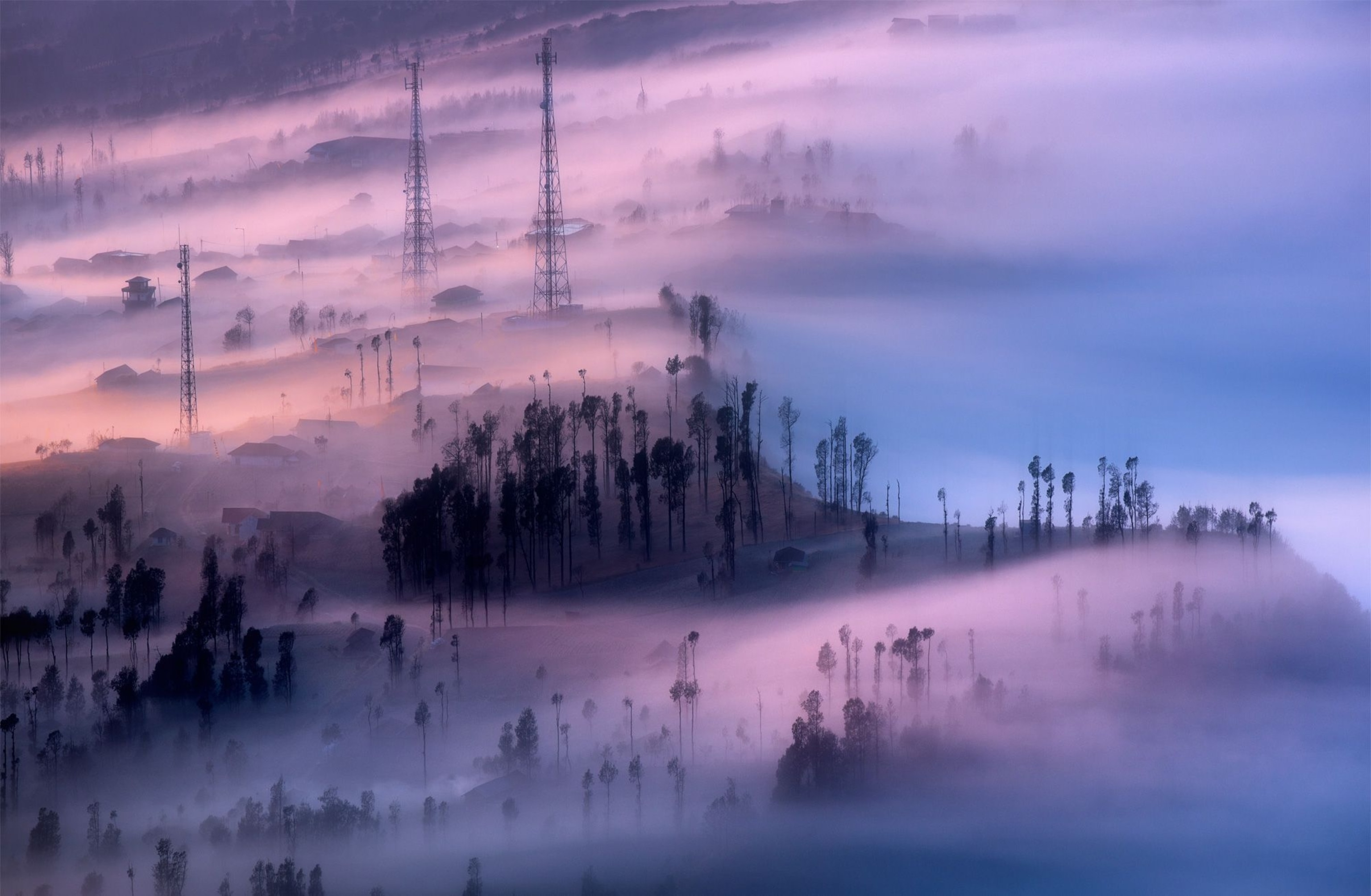 A heavy mist rolls over Bromo-Tengger-Semeru National Park in East Java, Indonesia, temporarily turning the park into something more closely resembling a watercolor painting. Mount Semeru, the peak that gives the park a portion of its name, is the highest in Java at more than 12,000 feet. Bromo is in reference to Mount Bromo, the most popular mountain in the region, and the Tengger people who live there.