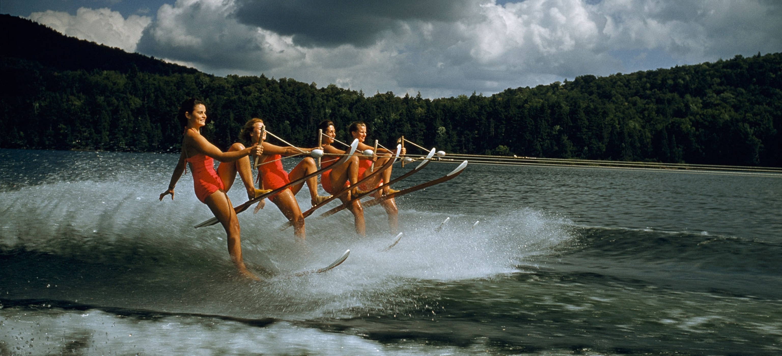 1956: A women’s water ski team lifts skis while being towed at 23 mph on Darts Lake in New York. Photo by Robert Sisson