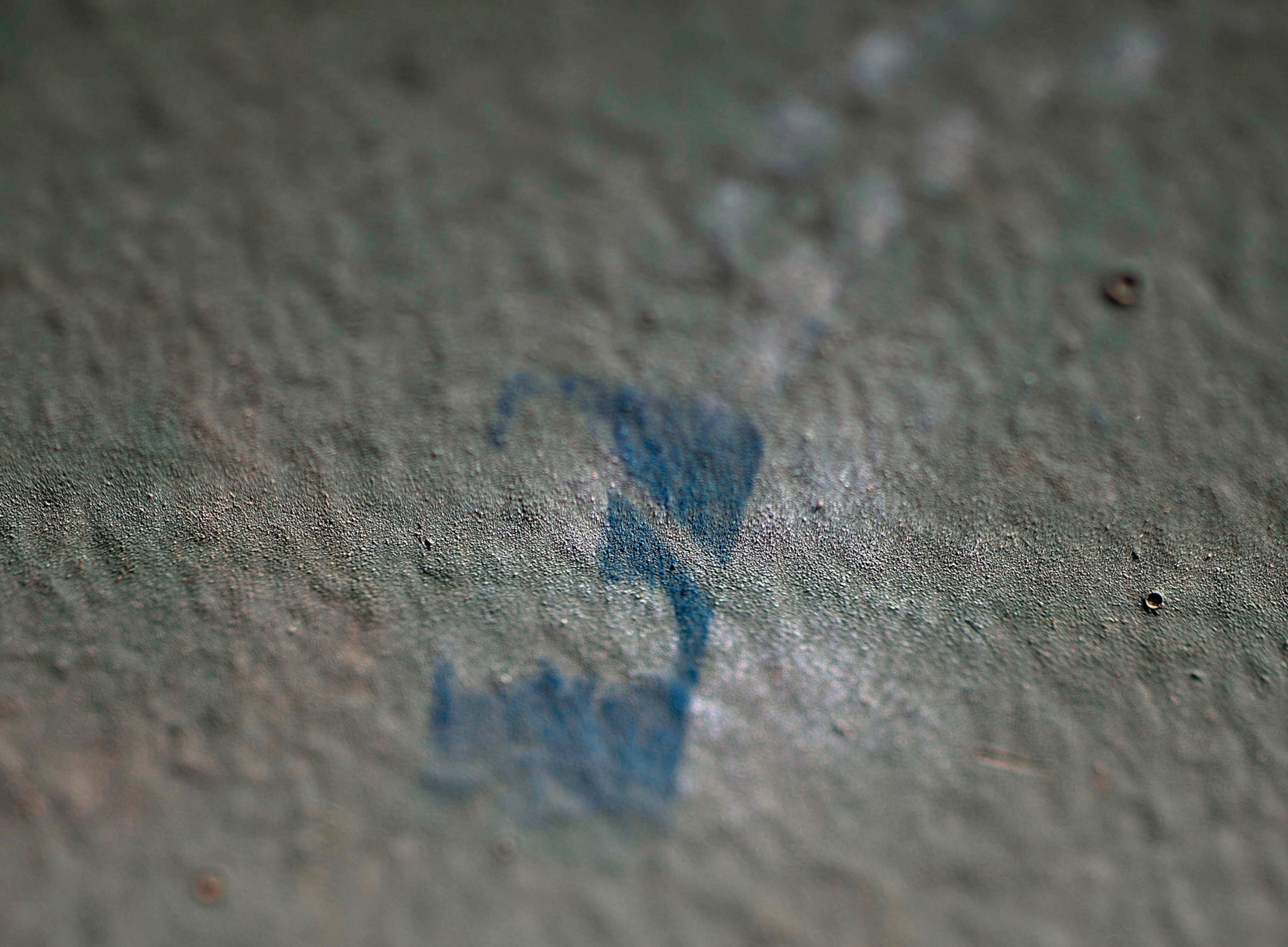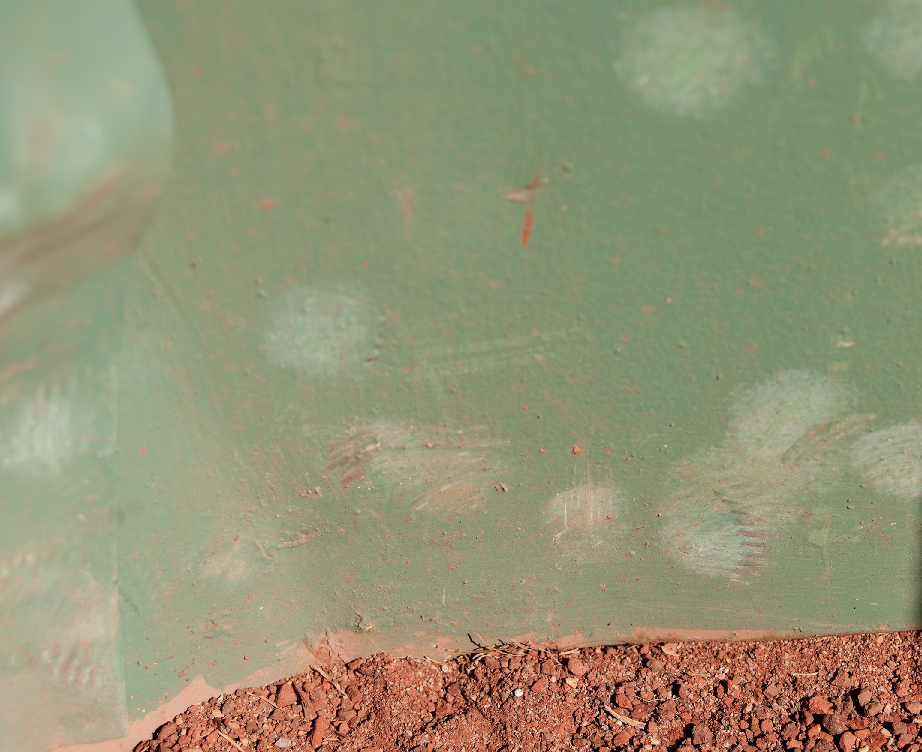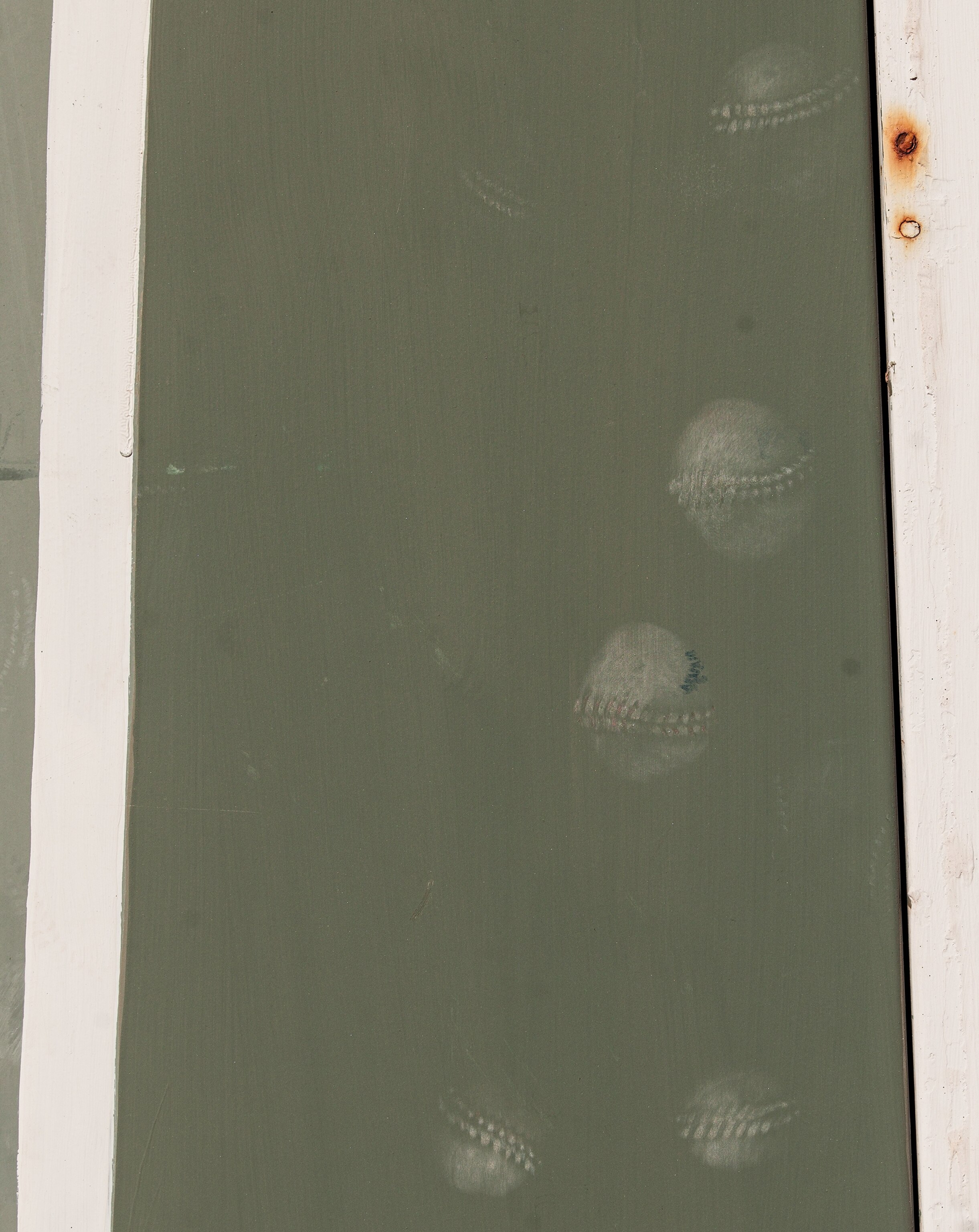 A veteran sports photographer, Gunther began going to the ballpark to photograph the marks on off days and before team batting practice. Using a tilt-shift lens, Gunther gets close to his subject while also trying to incorporate details beyond the “fingerprints.” Working mainly from the ground or a stepladder, Gunther has also scaled the wall on larger ladders perched along the Green Monster. “It’s not just composition,” he says, “it’s also texture, the details of the wall, the dirt, the bubbles in the paint. I liken it to finding a pretty shell along the shore.”