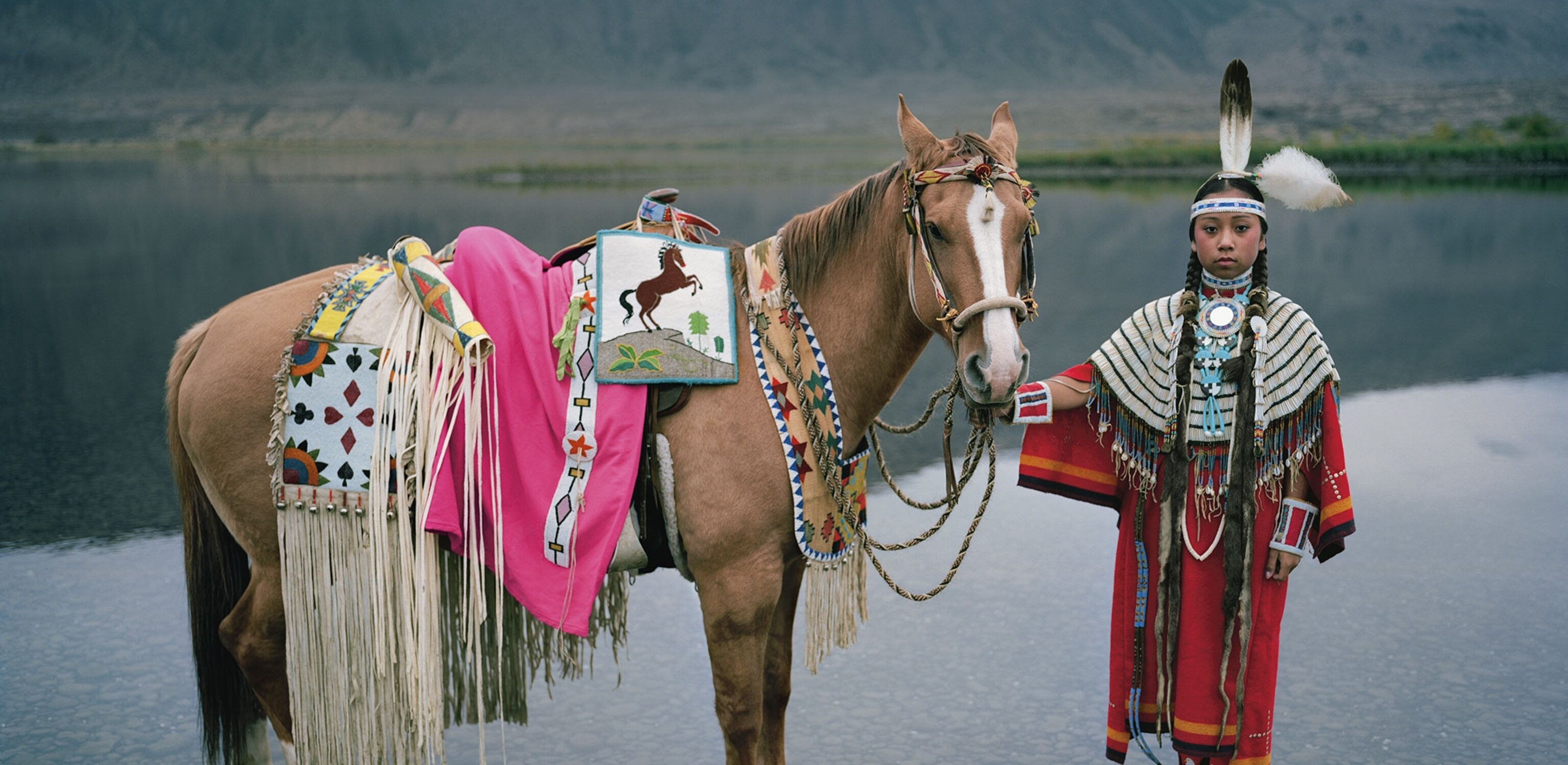 The second image is of Wanapum tribe member Destiny Buck in full-show regalia holding the bridle of her horse Daisy. Destiny stands confidently on a small rock surrounded by water, she is perfectly balanced even though a simple toss of her horse’s head could easily pull her off balance. Destiny gazes directly at you proud, relaxed and in total control of the moment. She seems wise beyond her years, very much like young Olivia.