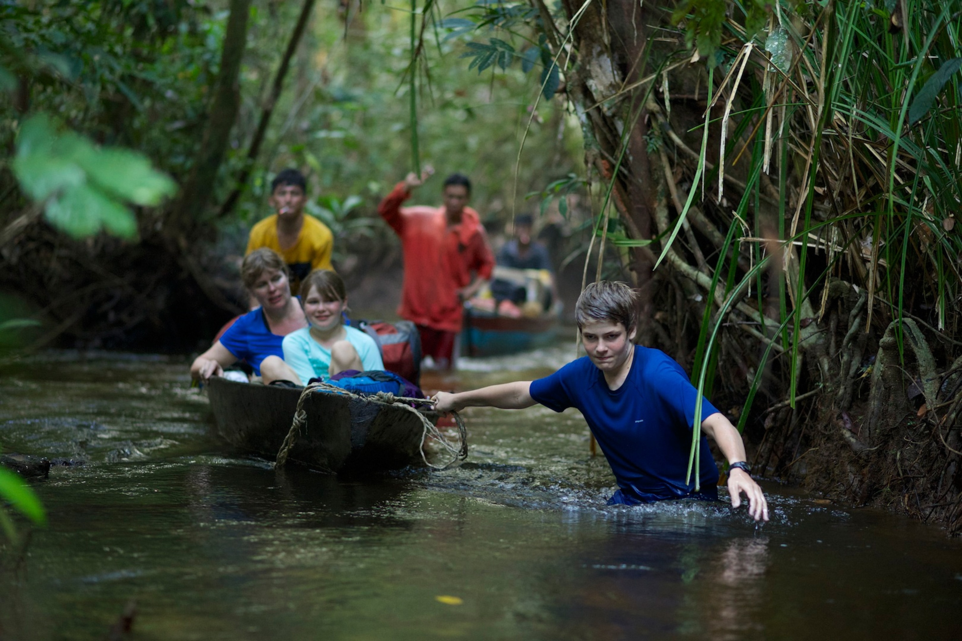 Finally we enter the forest. Trees start to loom over the water and the unbearable heat recedes. The bottom becomes shallower and sandy. Despite the ever curving and winding river, we make good progress—until we hit a log. Boom! The impact tips the boat and it half fills up with water. My dad holds his camera above his head. Luckily, most of our gear is in dry bags so none of our most important equipment is ruined. Despite this minor setback we finally arrive at the point where the river splits into two. We stop for about 20 minutes so the boatmen can make a new rudder for their boat. Below the fork, the river is red and murky. To the left it continues that way and to the right it becomes clear and clean, the direction we go. From here it can be anywhere from two to six hours to the research site depending on the water level. It’s now 4:00 pm.
