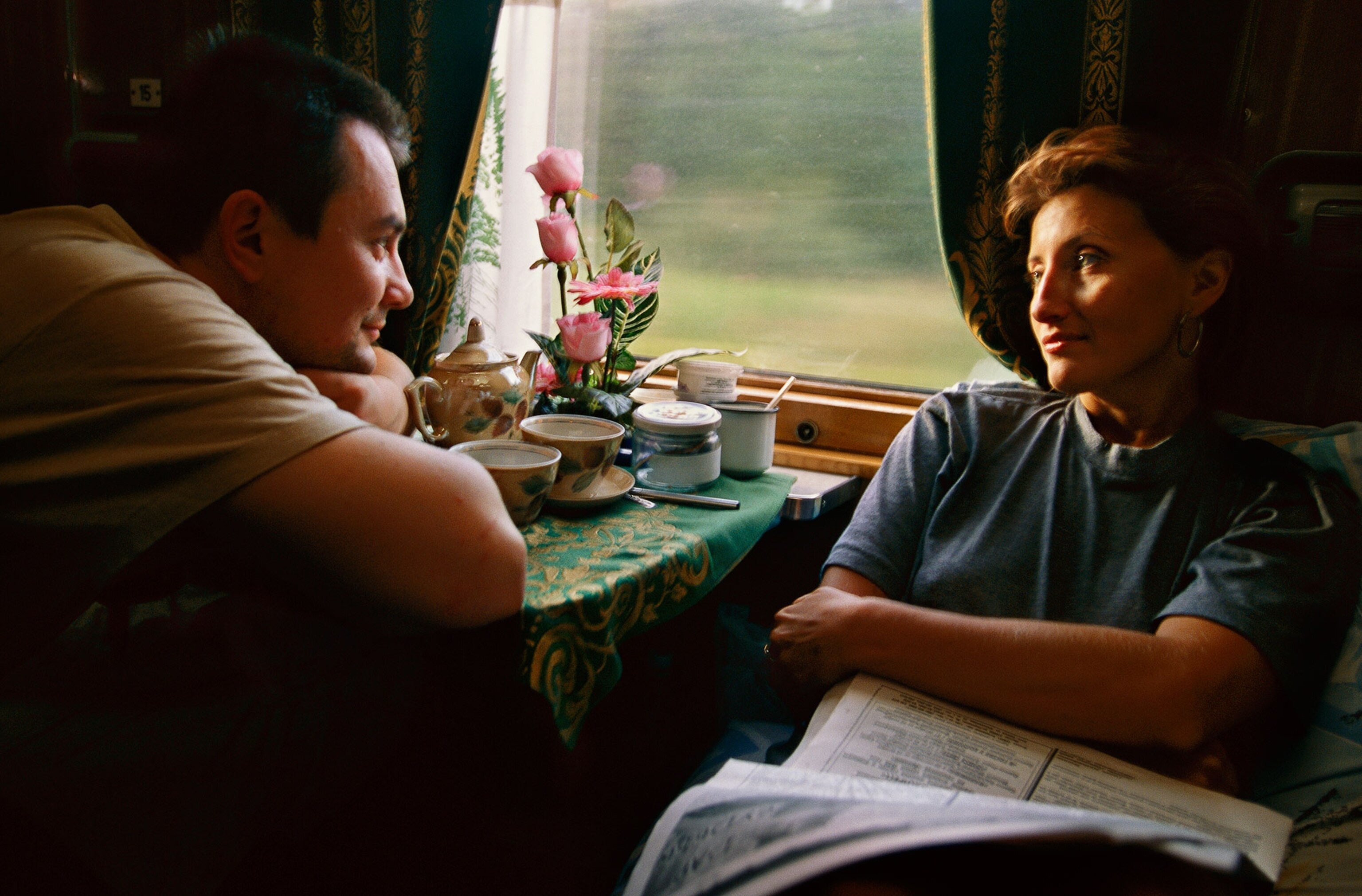 "Years ago on assignment for National Geographic magazine, I traveled eastward on the Trans-Siberian Railroad, traversing the Ural Mountains. It was a time when U.S.-Russian relations were improving and Westerners were welcomed with open arms. The passengers on the train had been informed about my mission to photograph on the train and had been asked for their support. After a couple of days most passengers, many of them long-distance travelers like me, were quite used to the sight of me with my cameras. A couple that occupied the compartment next to me had always given me warm smiles, but we had not found a chance to talk. One day, on my way back to my compartment, through the closed compartment door, I could see them engaged in a lovely conversation. I assumed they possibly were newlyweds in love. I signaled them to please not move. For a short while, I became the proverbial fly on the wall, silently witnessing tender, flirty moments unfold in front of my camera. When I quietly left, they barely took notice. A day later the young man was gone, and an elderly couple occupied the compartment with the young lady. Only then did I learn that the couple I had photographed had just met on the train. I did not ask more … I wanted to believe in the fleeting moments of love I had seen through my camera. But was my impression real? I will never know."