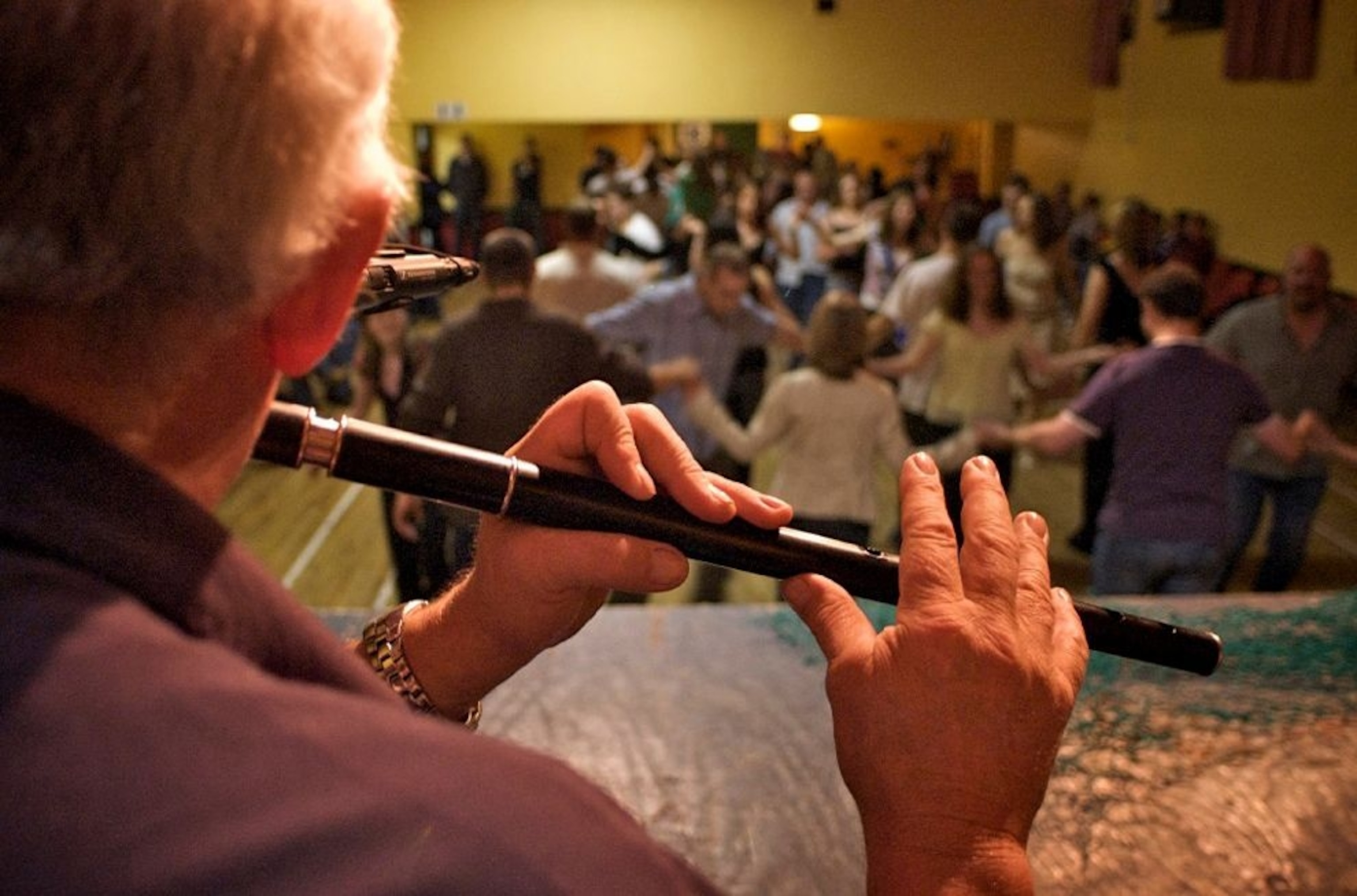Ireland's dances are always a hoot and not to be missed. This one on the Aran Islands was no exception. I got lucky here and could get behind the band looking out over the hall, an essential trick when you want to include the band and the dance action. Usually I would use the musicians as a frame while I focused on the dancers. But this time it worked well to focus just on the hands of the flute player and leave the dance action out of focus. And the stage lighting really made the hands stand out.