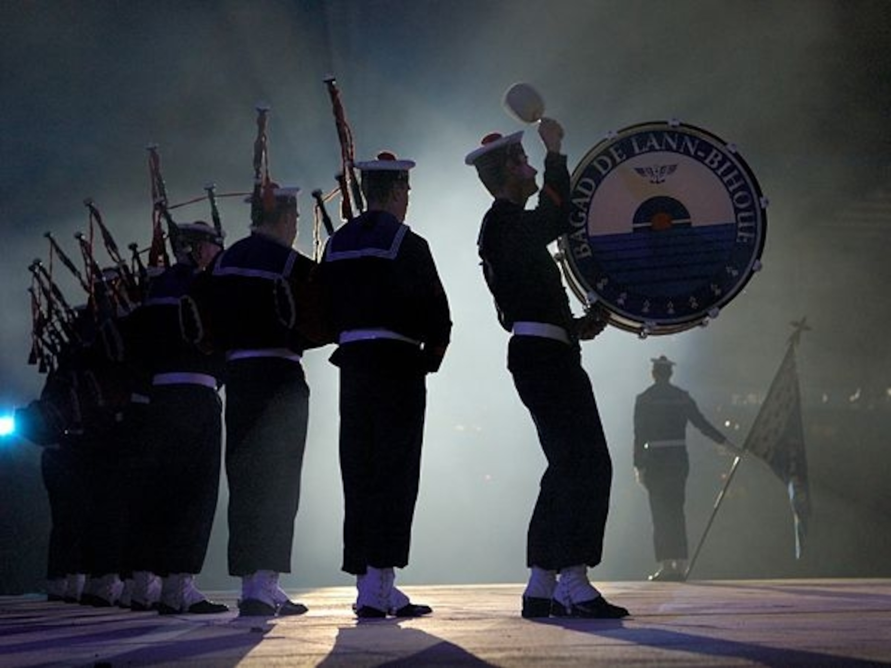 From the front the stage lighting at Festival Interceltique (the Celtic Festival) in Lorient, Brittany, was brilliant, flat and dull. Perfect for the audience, boring for pictures. But around from the back it was magic! The French Navy Band of Brittany was playing, the bass drummer really strutting his stuff, and the scene was full of atmosphere. There is one trick to remember here: move to block the spotlight with one of the subjects. If the spotlight is directly visible in the picture it will often be way, way too bright for the rest of the scene. Just move over a bit, as I did here, and cover it up with the drummer and the light becomes much prettier. You'll probably do better putting your camera on manual and adjusting the exposure with a few experimental shots. This kind of lighting is really tough for autoexposure metering to get right.