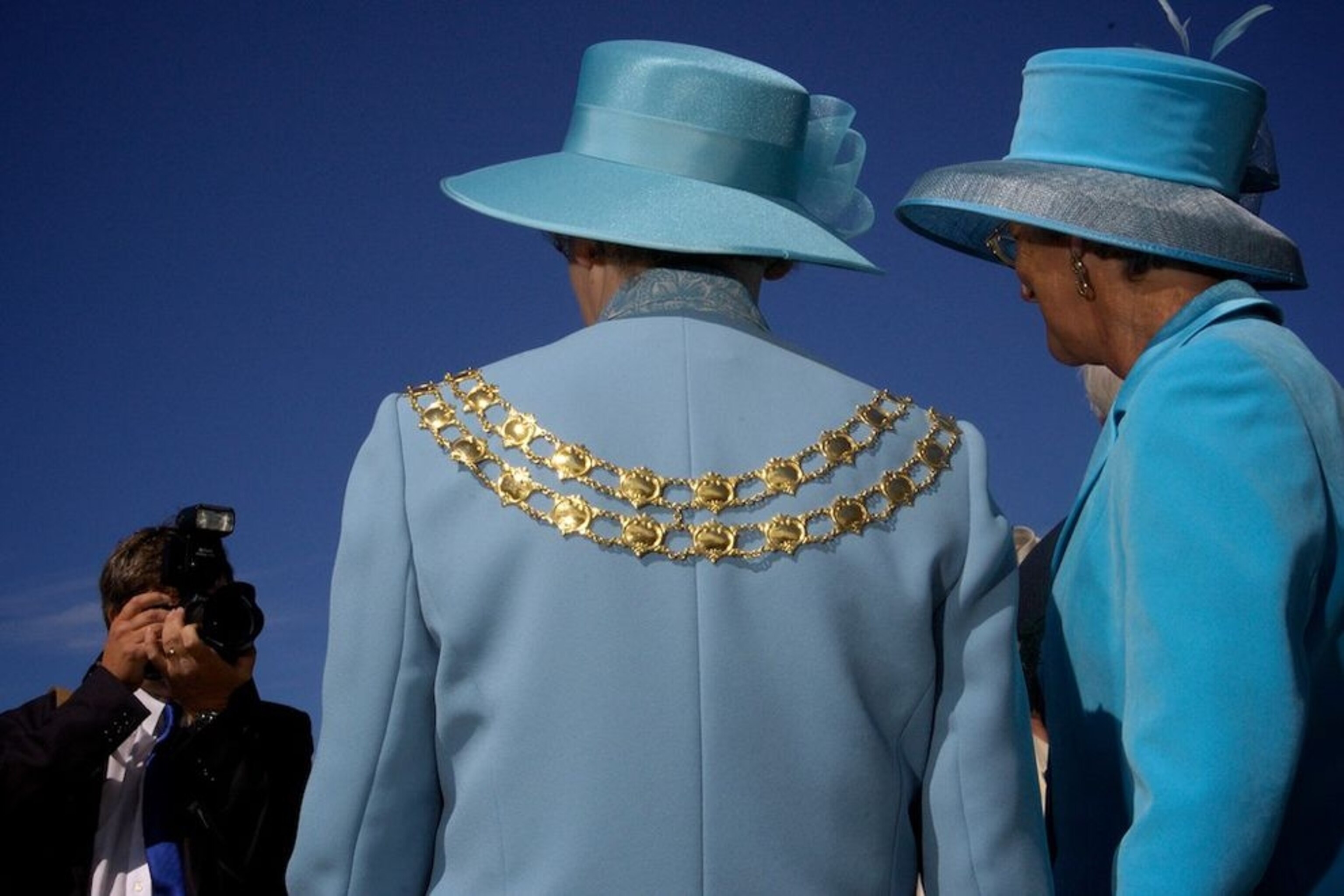 The women's fashions at Tynwald Day on the Isle of Man were a sight to see. But all too often when you focus on the people's faces, the fashion becomes secondary. Move around back and the fashion (and those wonderful hats) becomes the primary subject of the picture. As an added bonus this woman was a revered public official, festooned with official regalia, making the colors and design work even better. Then just a bit of the photographer out of focus in the background adds to the point that this is a high-power social event. And nary a face in sight.