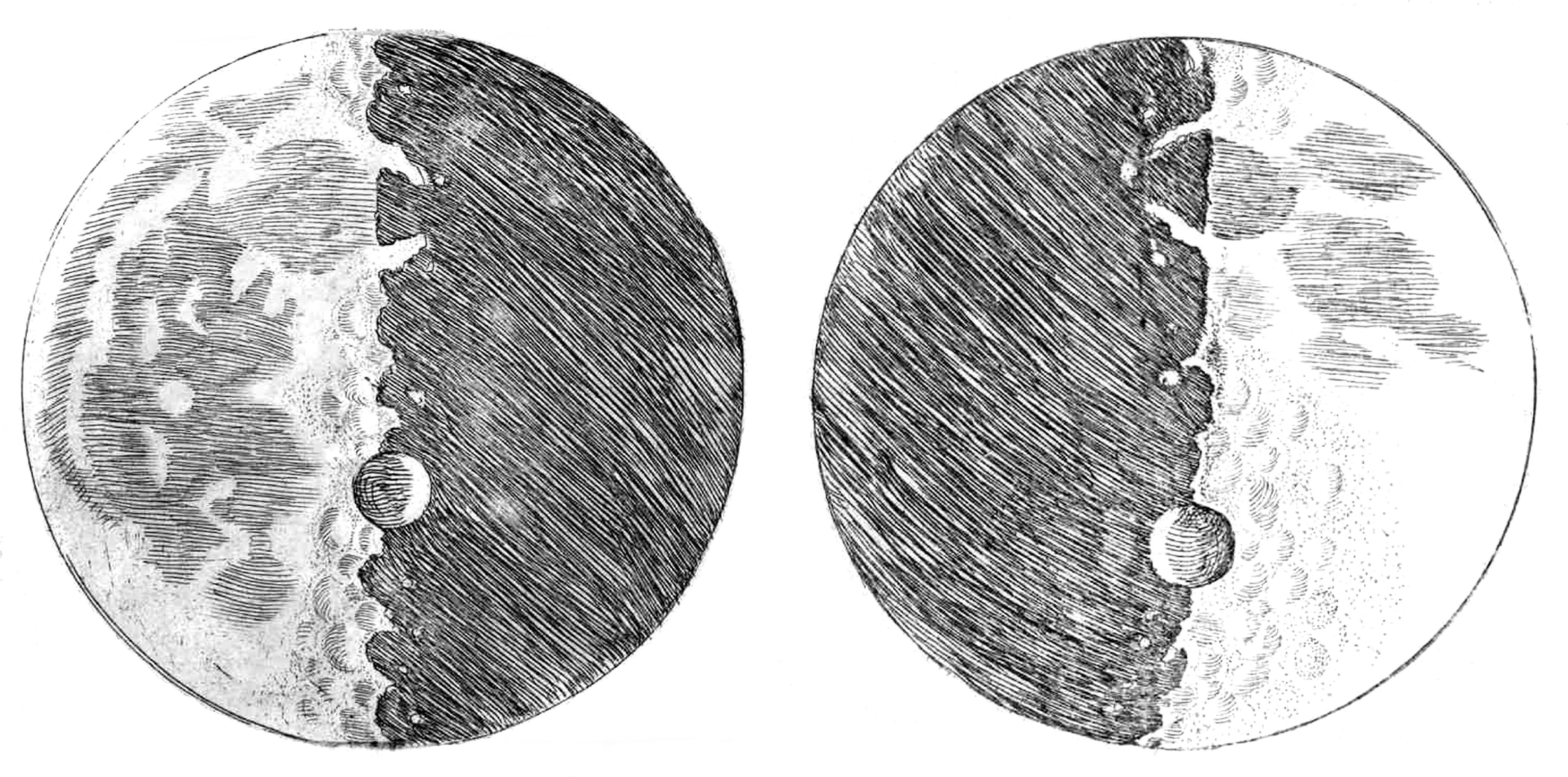 Credit must be given to the polymathic Galileo, for not only designing his own telescope (Harriot had bought his from the Netherlands) but for the myriad of elegant deductions he made from his own observations of the moon and other celestial bodies. He was the first to note the moon as an inferior sphere, and as being a place of heavy relief like the earth—which he deduced by noting the presence of craters and the behavior of shadows. “I have noticed that the small spots... have the dark part towards the sun’s position, and on the side away from the sun they have brighter boundaries, as if they were crowned with shining summits,” he wrote in 1610.