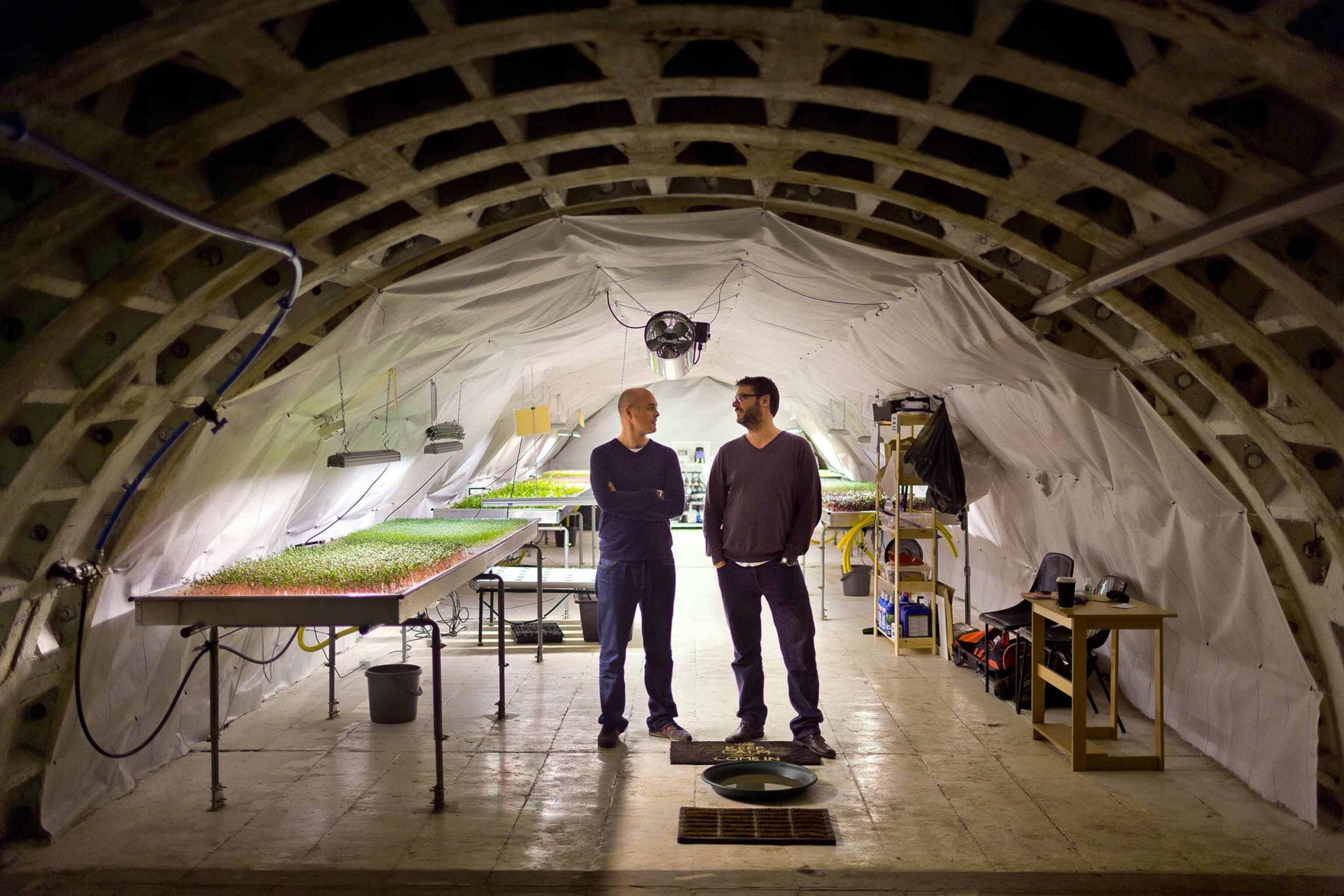 “We don’t know entirely what to expect,” says Steve Dring while we’re walking through the dark tunnel. Dring, along with his business partner, Richard Ballard, came up with the idea last year to build a farm underground, away from a natural source of water and far removed from the sun. Rent for the space was cheap as long as they could live with a few small water leaks in the 70-year-old tunnels. No one else was using the facility (a night club was turned away because there weren’t enough exits). Once Dring and Ballard had gotten a lease to grow crops, their lawyer admitted that he was curious about what the two men might actually grow in a dark, private space using artificial lights.