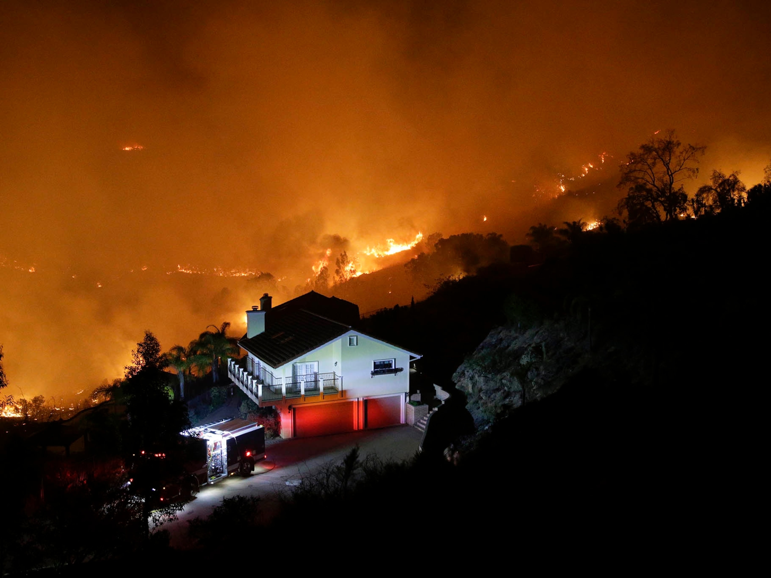 Remnants of a fire that destroyed a home burn as night falls in Carlsbad. San Diego county has declared an emergency, requesting assistance from Governor Jerry Brown, according to the Los Angeles Times.