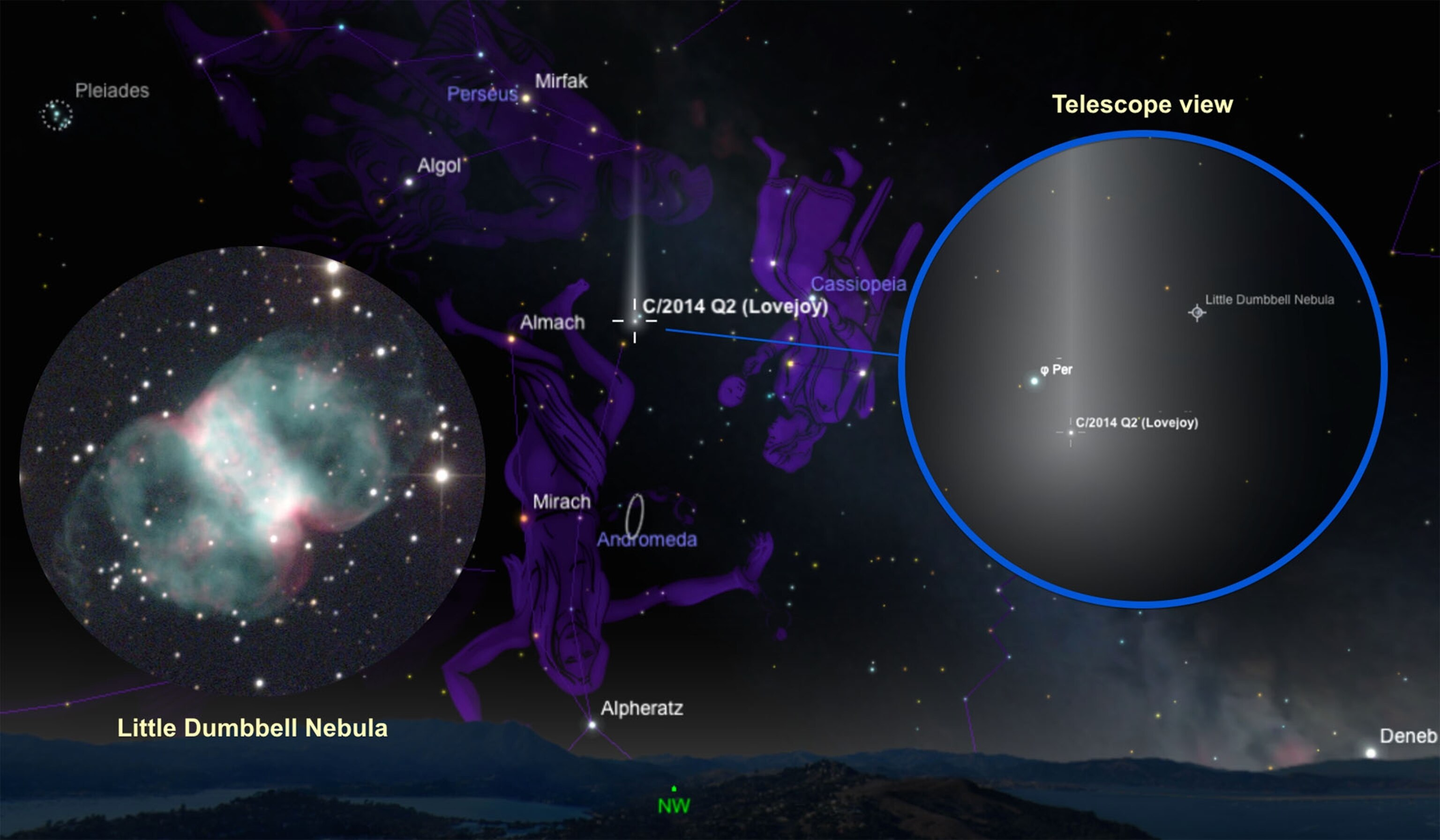 And by coincidence, Lovejoy will be close to Messier 76, the Little Dumbbell Nebula, which is a gaseous remnant of a sun-like star. Located some 6,400 light-years from Earth, the tenth-magnitude cloud measures nearly three light-years across.