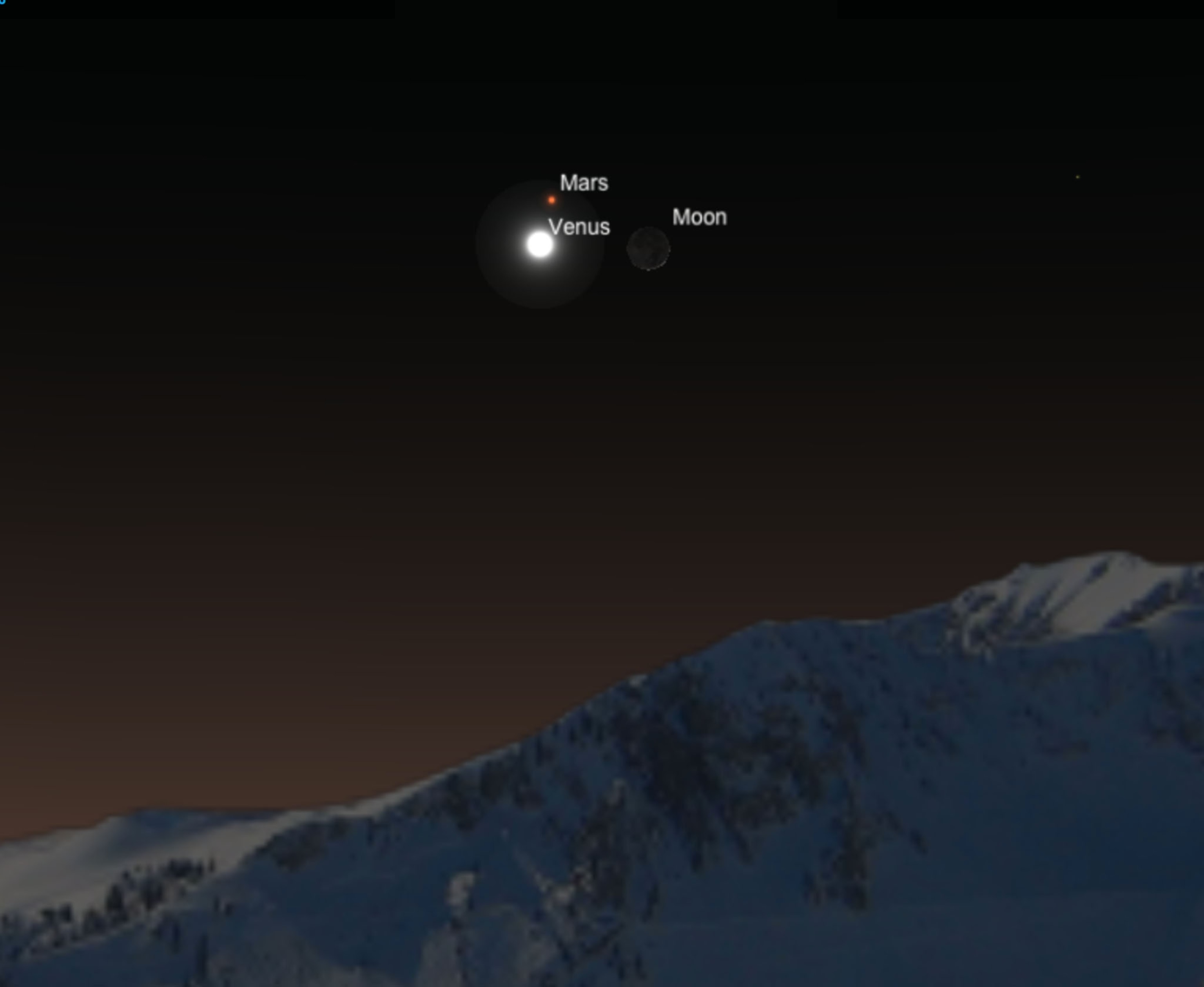 Lunar Triangle. After the sun sets on Friday, February 20, look toward the southwest for a tight triangular formation formed by a thin crescent moon, the white Venus, and ruddy Mars.