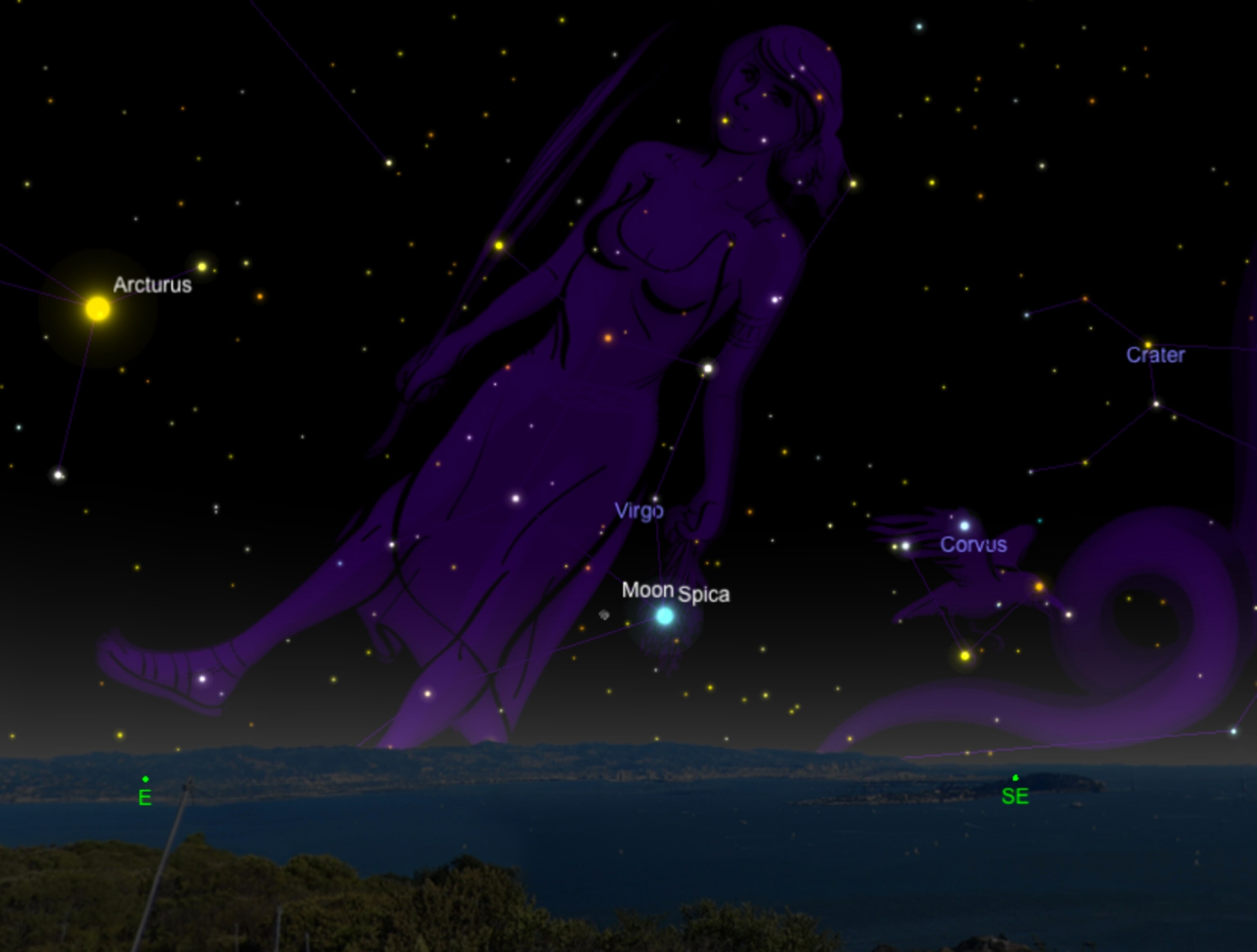 Moon and the Maiden. Near midnight on Sunday, March 8, look for the waning gibbous moon hanging low in the northeast sky, next to the blue-white stellar beacon Spica in the zodiacal constellation Virgo.
