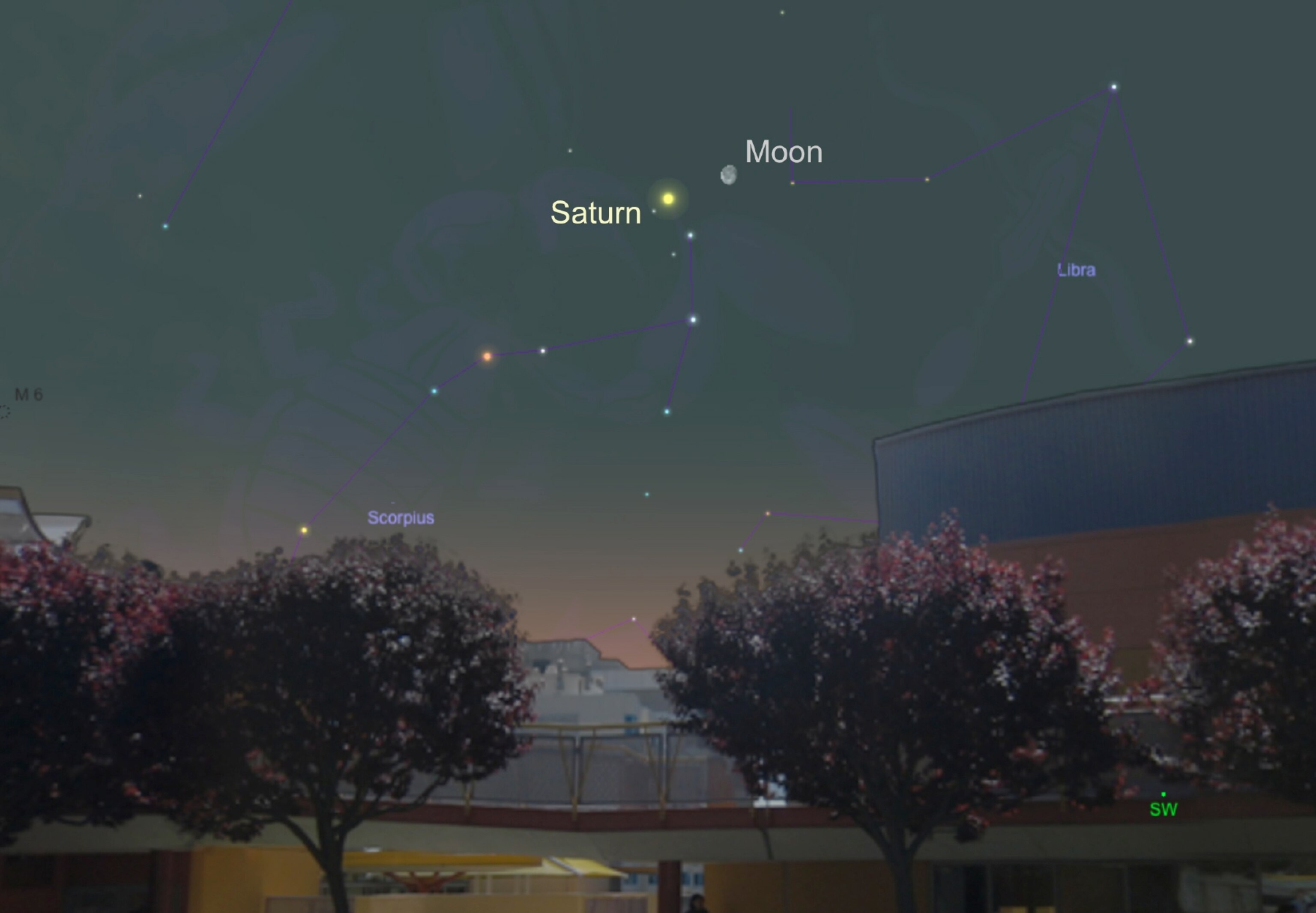 Saturn and moon. At dawn on Wednesday, April 8, look for the waning gibbous moon passing just north of Saturn. The pair appear only 2 degrees apart—equal to the width of two fingers at outstretched arm’s length.