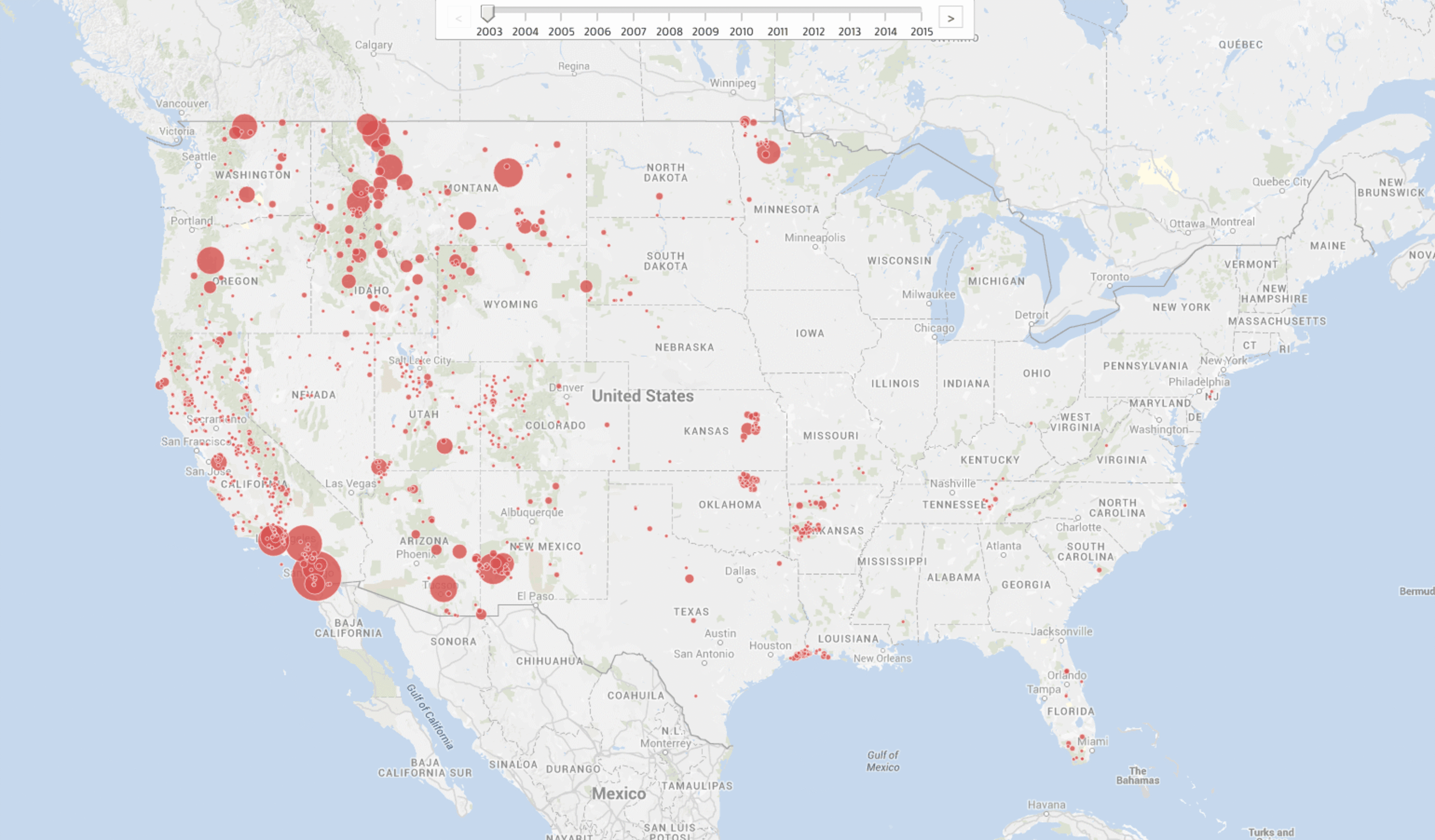 To keep track of current wildfires and to place them in a larger context, my collaborators and I have created an interactive map of fires in the United States. It tracks wildfires reported by GeoMAC, a federal clearinghouse of fire information run by the U.S. Geological Survey, as well as past wildfires going back as far as 2003.