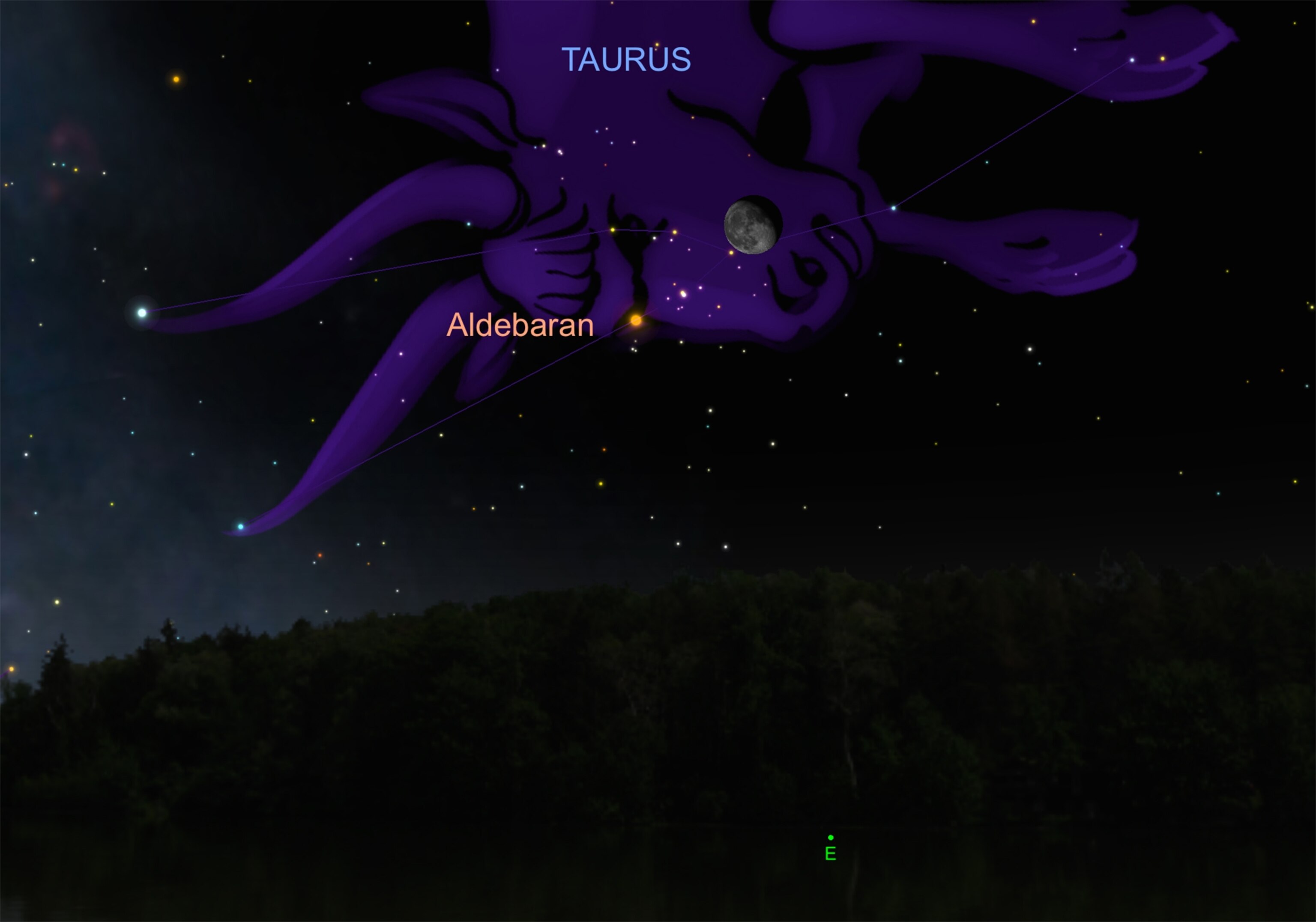 As a bonus on Friday morning, 66-light-years distant Aldebaran will appear to be eclipsed or occulted by the moon at dawn for viewers on the west coast of North America, and during daylight for the rest of the American continent.