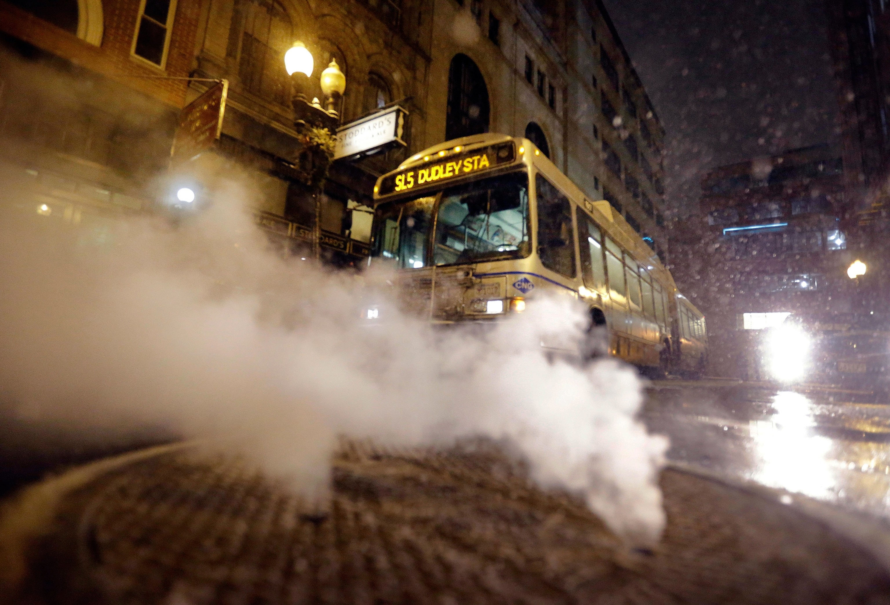 Steam emerges from a manhole cover in Boston, where waste heat from a nearby power plant travels underground to heat buildings in the city.