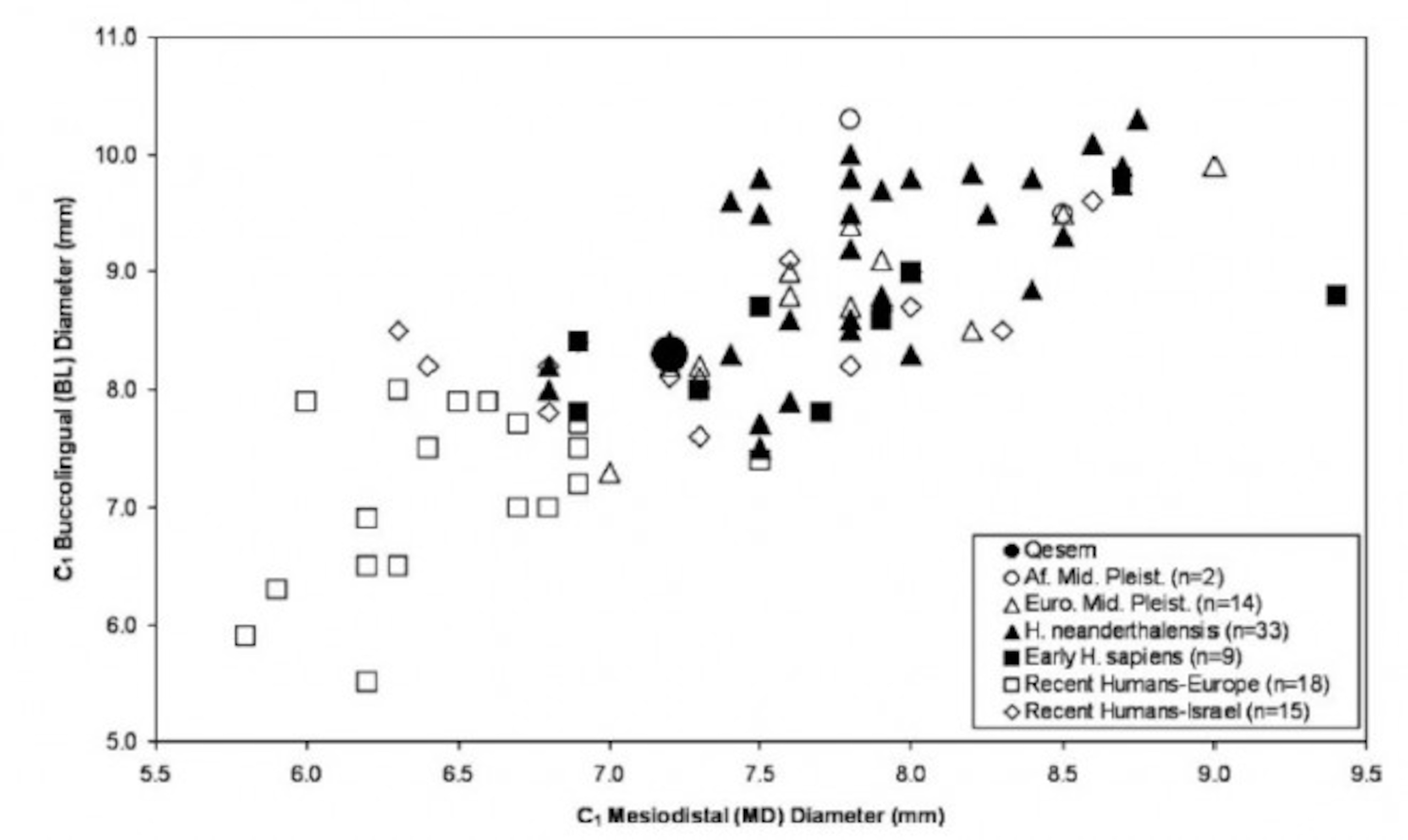 What sort of human – or humans – do these teeth represent? That is unknown. When compared to the teeth of Neanderthals and prehistoric Homo sapiens, the Qesem Cave teeth consistently fell at the overlap of variation between the groups. In fact, both the Neanderthals and prehistoric human populations exhibit a significant amount of variation in tooth shape, making the task of identifying the owners of the Qesem teeth extremely difficult. The graphs printed in the paper show the spread of variation in human teeth based upon their dimensions from front-to-back (mesiodistal) and side-to-side (buccolingual). There is a great degree of overlap between Neanderthals and early Homo sapiens in terms of these parameters. The only teeth that appear to group more closely with modern humans are the geologically older lower premolars, and even those fell along the border of Neanderthal variation.