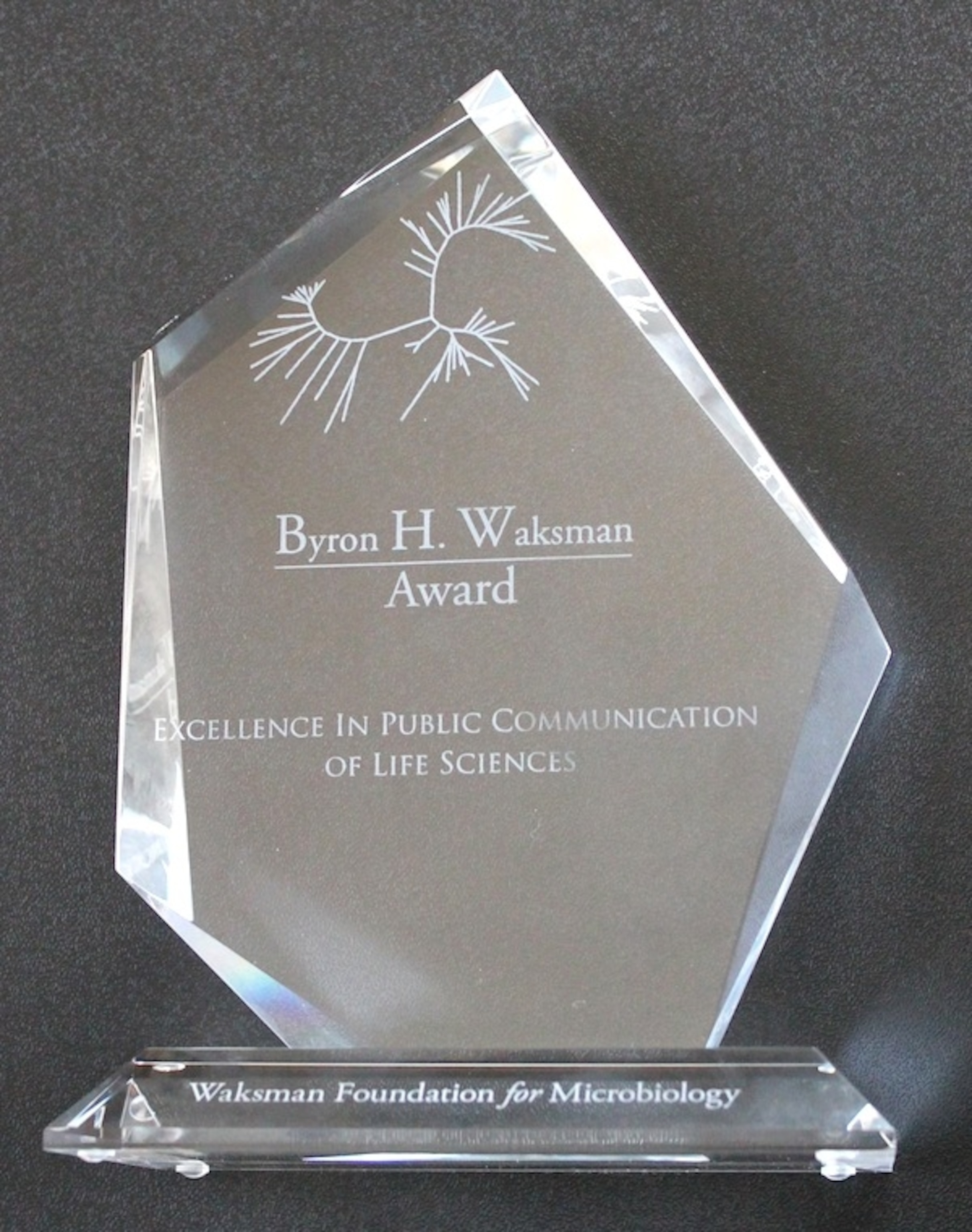 Yesterday I went to Rutgers University to give a talk about medical ecology. Afterwards, I got a delightful surprise: Amy Chen Vollmer, the president of the Waksman Foundation for Microbiology, got on stage to announce I had won the Byron H. Waksman Award for Excellence in Public Communication of Life Sciences.