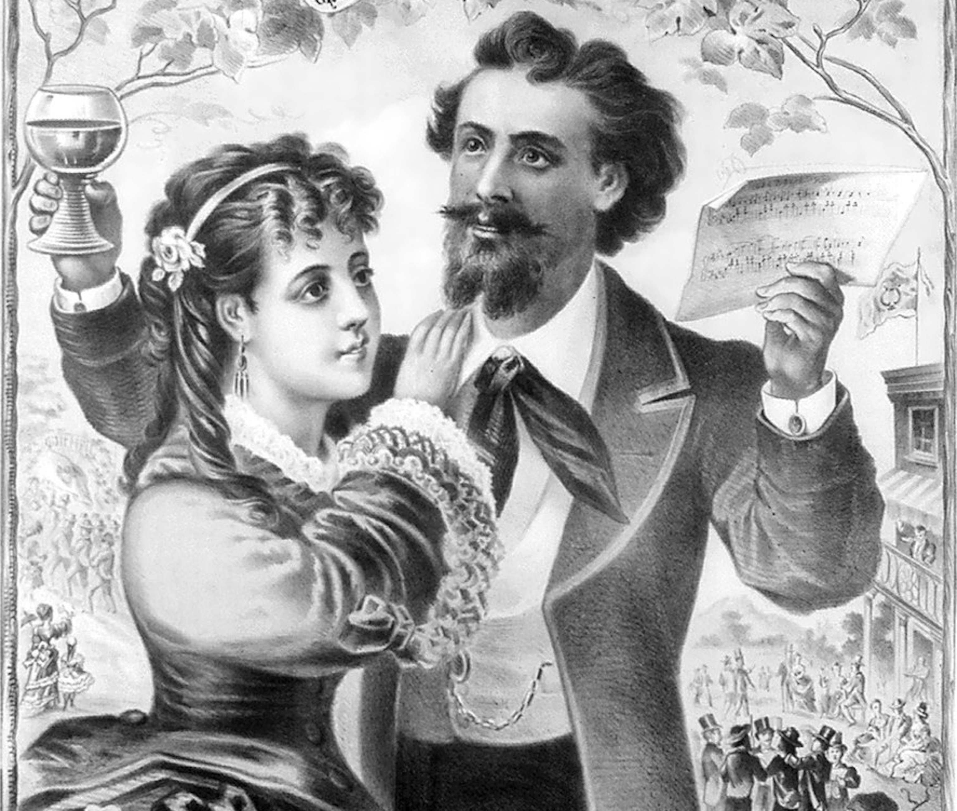 The image is a print published by Kimmel and Voigt in New York, 1873. According to Wikimedia Commons, the German text at the bottom means: “He who does not love wine, wife, and song will be a fool his whole life long.”