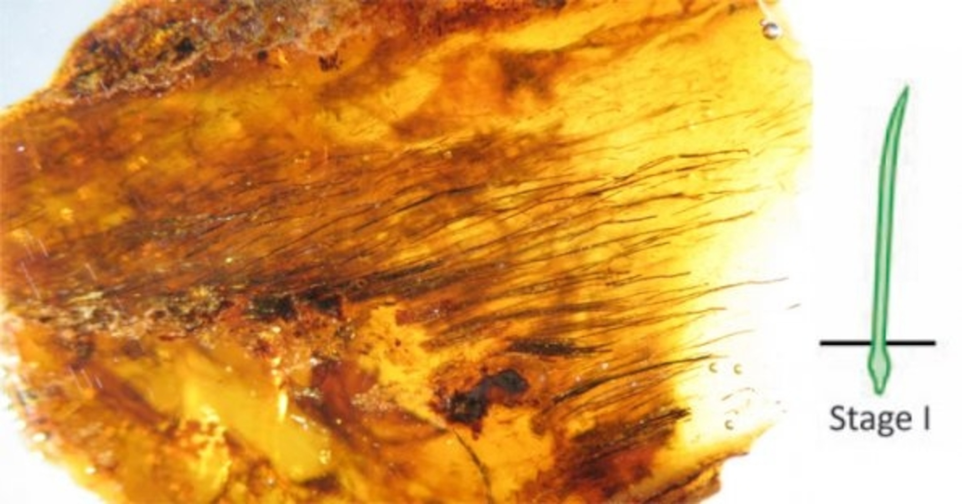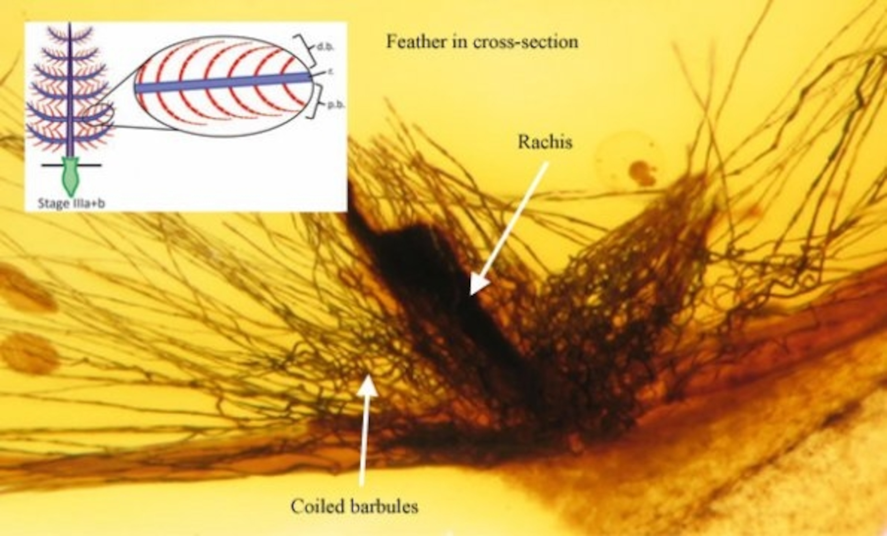 This is the first stage. They’re simple, single filaments, found in dense forests and unrecognisable as feathers. They’re different from the hairs of mammals because they don’t have any scales along their length. Nor are tubes from fungi or plants for they lack the thick cell walls that these groups have. They look a lot like the downy “dino-fuzz” that covered Sinosauropterx, the first dinosaur to be found with evidence of feathers. Sinosauropteryx’s fuzz was largely a reddish-brown colour, while those found in the amber ranged from dark to almost transparent.