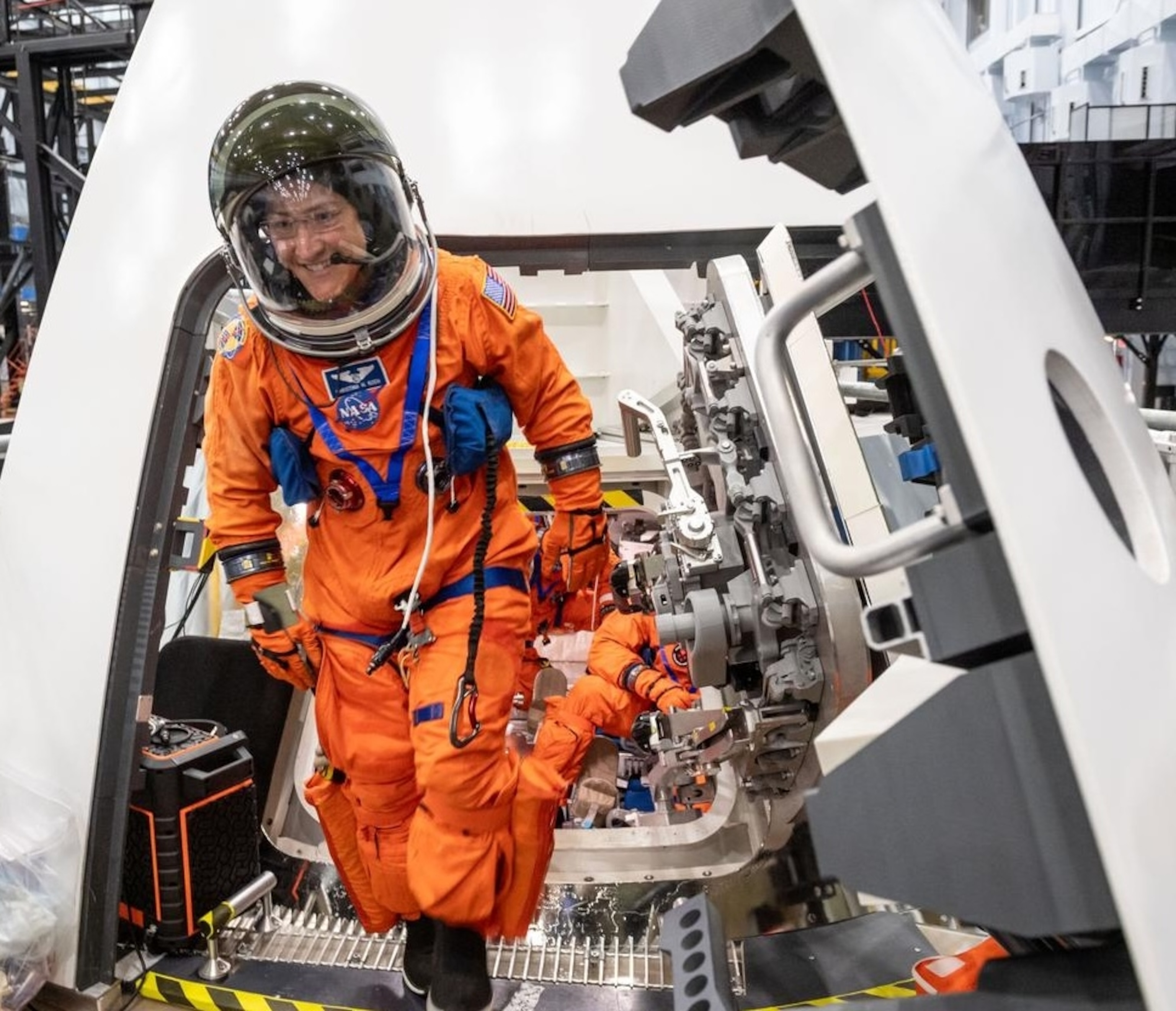 Even though the Orion replica is in a warehouse and not stacked atop a 300-plus-foot-tall rocket, the astronauts behave as if it is. To enter, Koch avoids a “zone of death” on the floor, marked with bright caution tape. “Because on the real vehicle, that will not be somewhere we can go,” she says. “We’re very careful to train like we fly.”