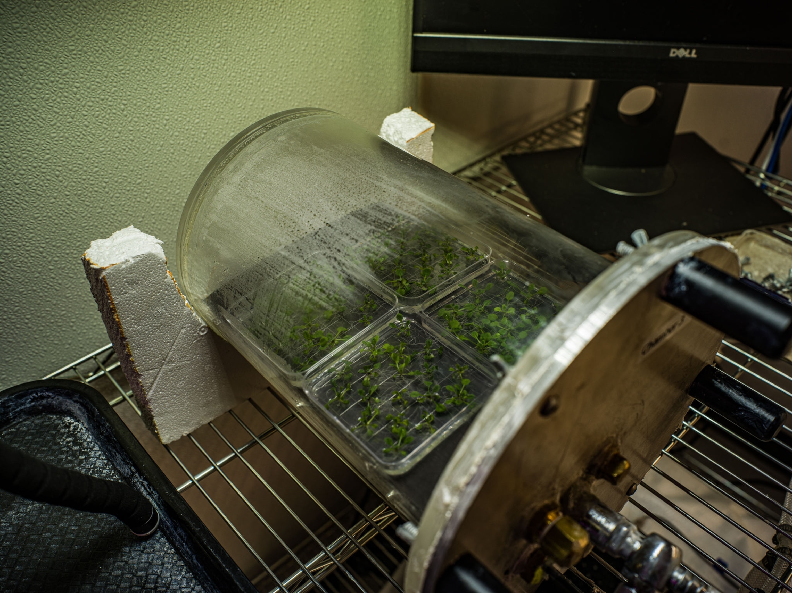 When Rodrigues and his colleagues subjected baby sweet potato plants to this experience for 30 days, they found that the plants grew thicker stems than their static counterparts. They weren’t more photosynthetically productive, though, which means that in the absence of the familiar pull of gravity, the sweet potatoes may have allocated more energy to fortifying their bodies than feeding themselves. The sweet potatoes also grew better under blue light, rather than a mixture of wavelengths, which suggests that the plants were less stressed out under that lighting, Rodrigues says.