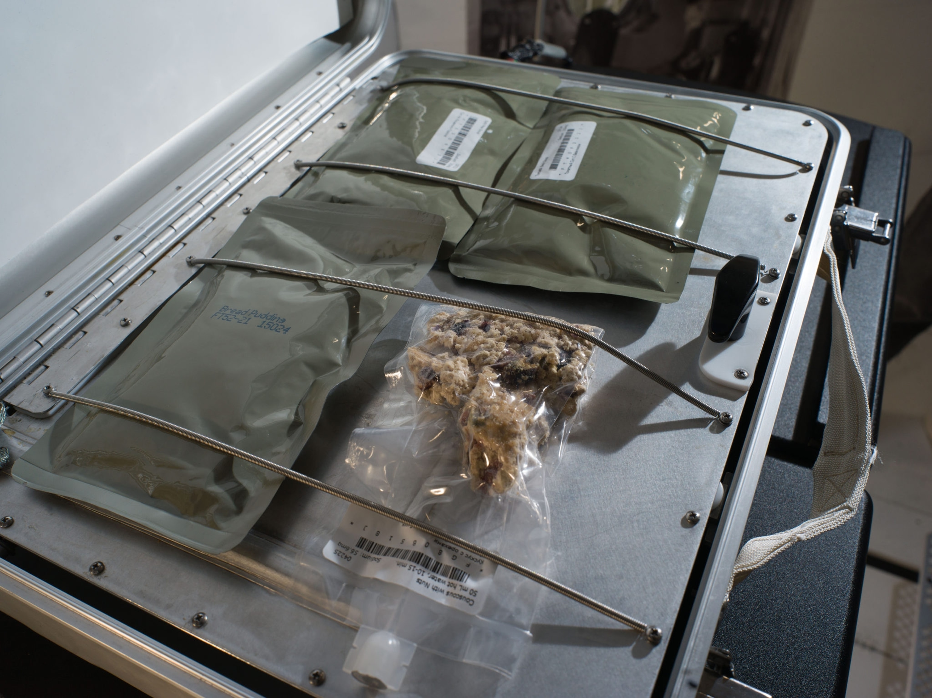 McKinley clicks open the latches to reveal a metallic plate crossed with springy straps on either side. He slips an assortment of packets beneath the straps: tomato basil soup, split pea soup, Indian fish curry, bread pudding. The plate reaches 185 degrees Fahrenheit, and heats food and drink items to 155 to 175 degrees Fahrenheit—a nice upgrade from the Apollo days, when astronauts reheated foods with hot-water guns. Toasty provisions can be ready within 15 minutes, or under an hour if the warmer is stuffed to the max capacity of 12 packets.