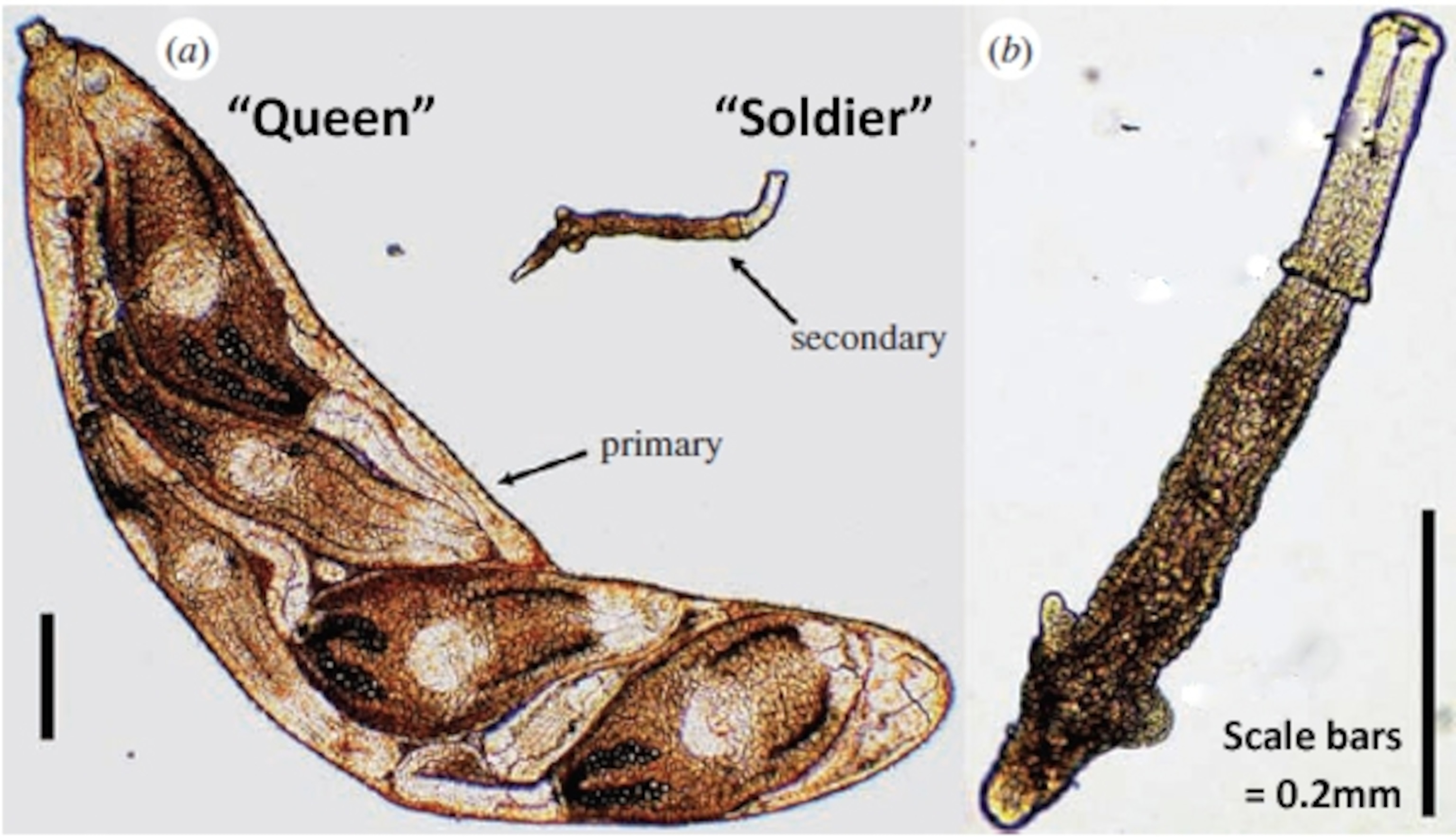 Hechinger found that the soldier class is always much smaller than the primary one, the size of a finger compared to an arm, and there are few individuals of intermediate size. This, combined with their distinctive shape, suggests that the soldiers aren’t just young versions of their bigger colony-mates.