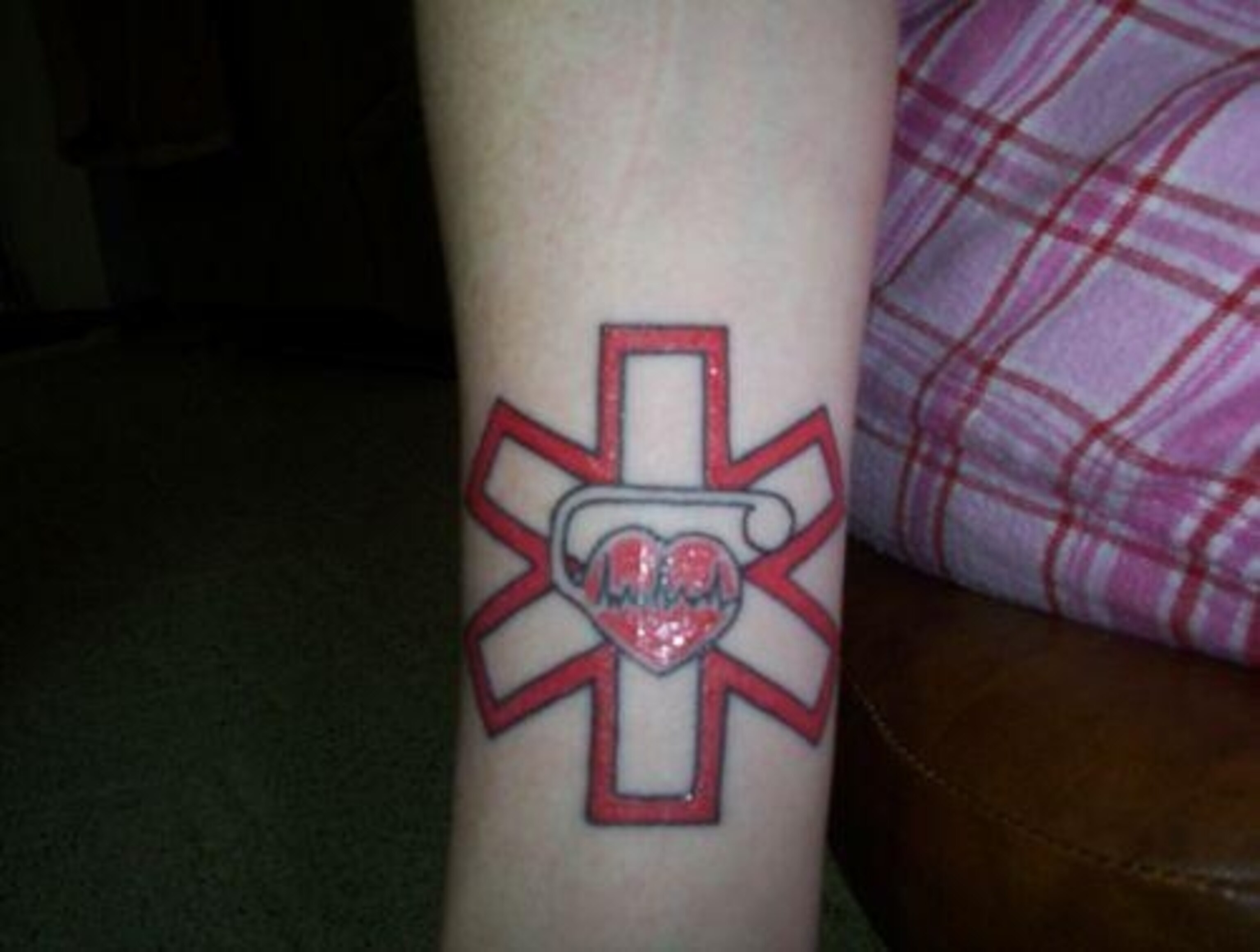“I was born with a decent size hole in my heart and my parents were told that it would eventually go away with time. It didn’t, and progressed into irregular beating and cardiac arhythmia. Finally, when I was 18, my doctor noticed that the sound of my heart had changed and that she didn’t think it was functioning the way it should be. I went to a specialist and he determined that the AV node was blocked and that my heart was only beating half of what it should be. I got a pacemaker on December 23, 2003 when I was just 18. A couple years later, as a Christmas gift, my fiance paid for me to get the medical symbol for the pacemaker tattooed on my upper right wrist.”