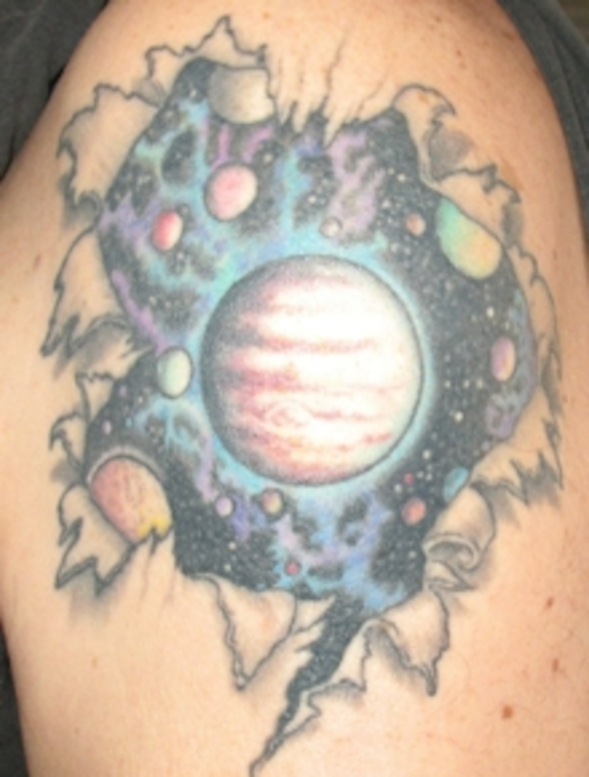 Bob Howe writes, “In 1992, at age 34, I decided to get a tattoo. I’m a speculative fiction writer. I wanted something grounded in the natural world, that symbolized the connection between inner and outer space, and that was unequivocally male without being bellicose. I wanted something that wasn’t a momentary fad, that was timeless and eternal: I chose Jupiter. Two years later, Shoemaker-Levy 9 slammed into the face of the planet, altering it forever.”