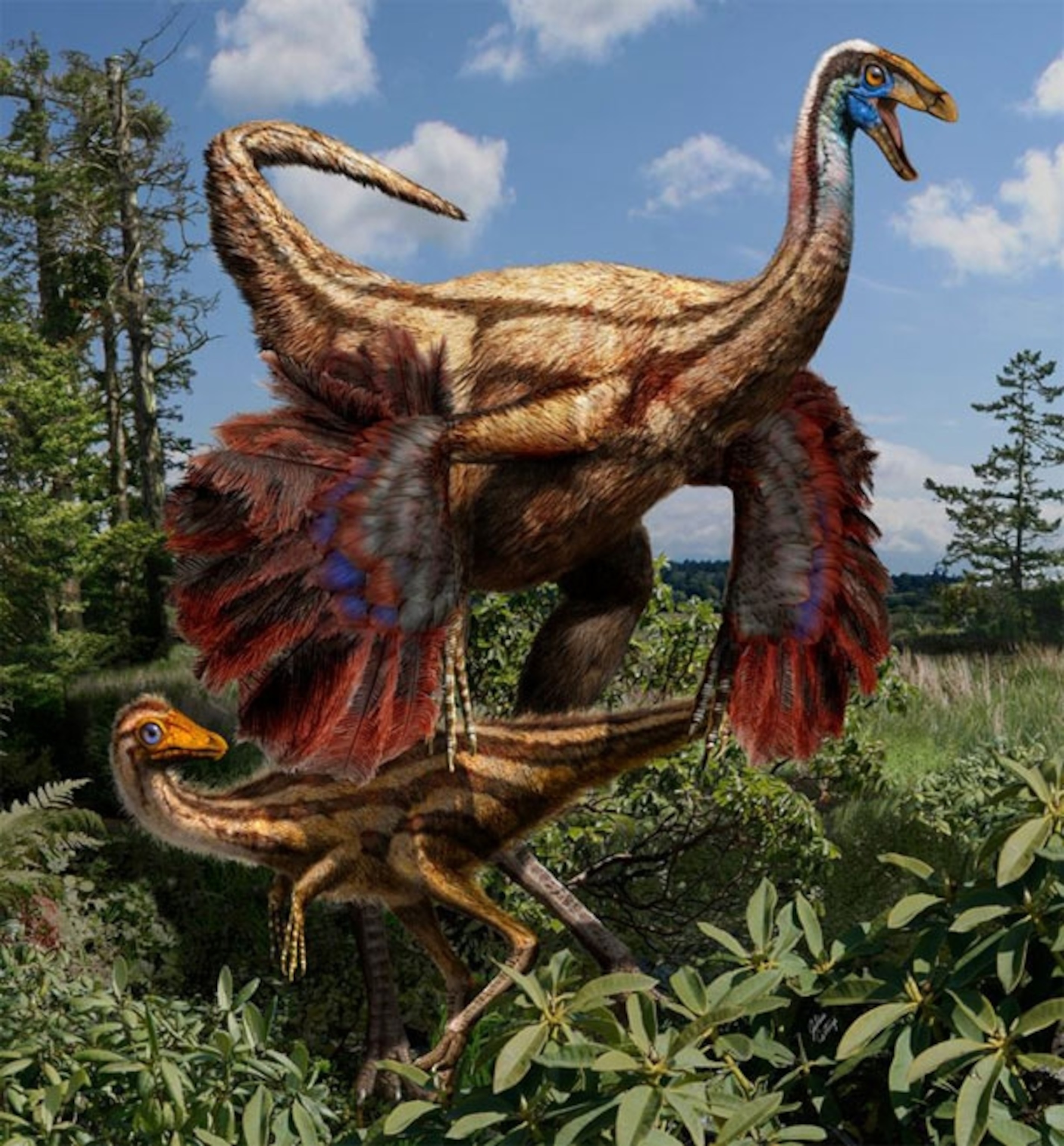 Now, the bird mimic has become even more bird-like. By analysing two new specimens, and poring over an old famous one, Darla Zelenitsky from the University of Calgary has found evidence that Ornithomimus had feathers. And not just simple filaments, but wings – fans of long feathers splaying from the arms of adults. (More technically, it had “pennibrachia” – a word for wing-like arms that couldn’t be used to glide or fly.)