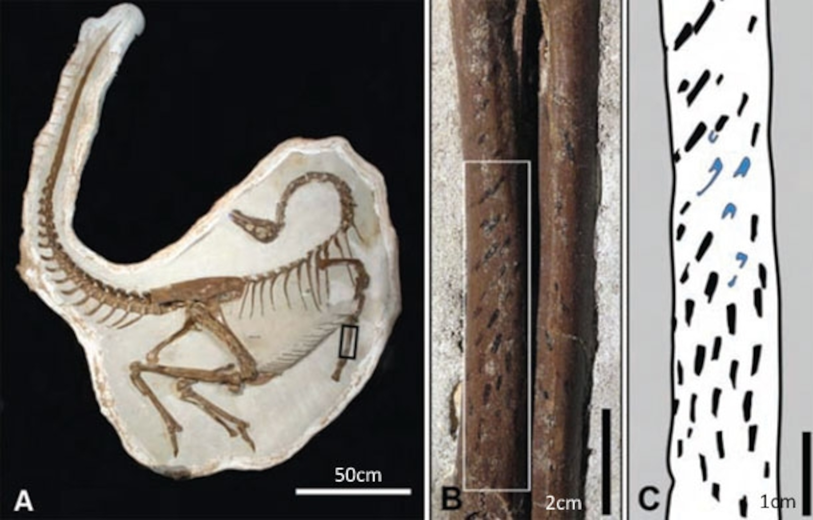 The third Ornithomimus is a classic, an almost complete skeleton that was found in 1995, and also lives in the Royal Tyrell Museum. When Zelenitsky examined its arms, she noticed around 70 short straight carbon-black strokes. She thinks this adult had pennibrachia, and the traces represent the rigid shafts in the middle of its feathers. The strokes have the right size, shape and position. They’re only found on the back edge of one of the two forearm bones, and their angles gradually change down the arm. If you looked at the wing of a modern bird, you’d see exactly the same pattern of feather attachments.