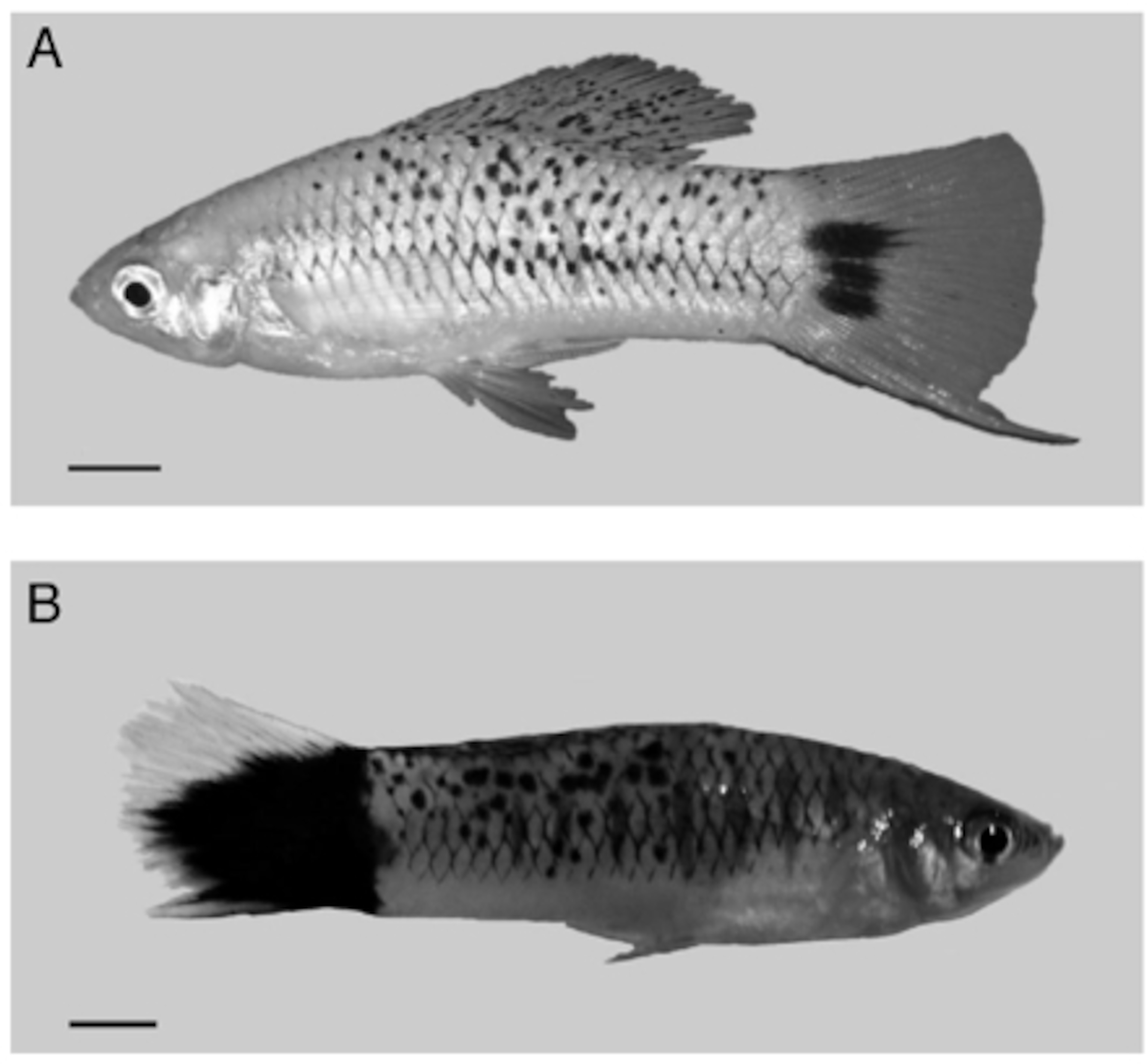How does such a dangerous gene continue to survive for so long? Fernandez and Morris have just published an experiment that might solve the mystery. A lot of delicate swordtails have large dark spots on their tails, like the one shown on the top fish here. Xmrk is essential for producing those spots. Other fish have been shown to use stripes, spots, and other visual patterns to attract mates. So Fernandez and Morris wondered what the female delicate swordtails thought of the Xmrk spots on males.