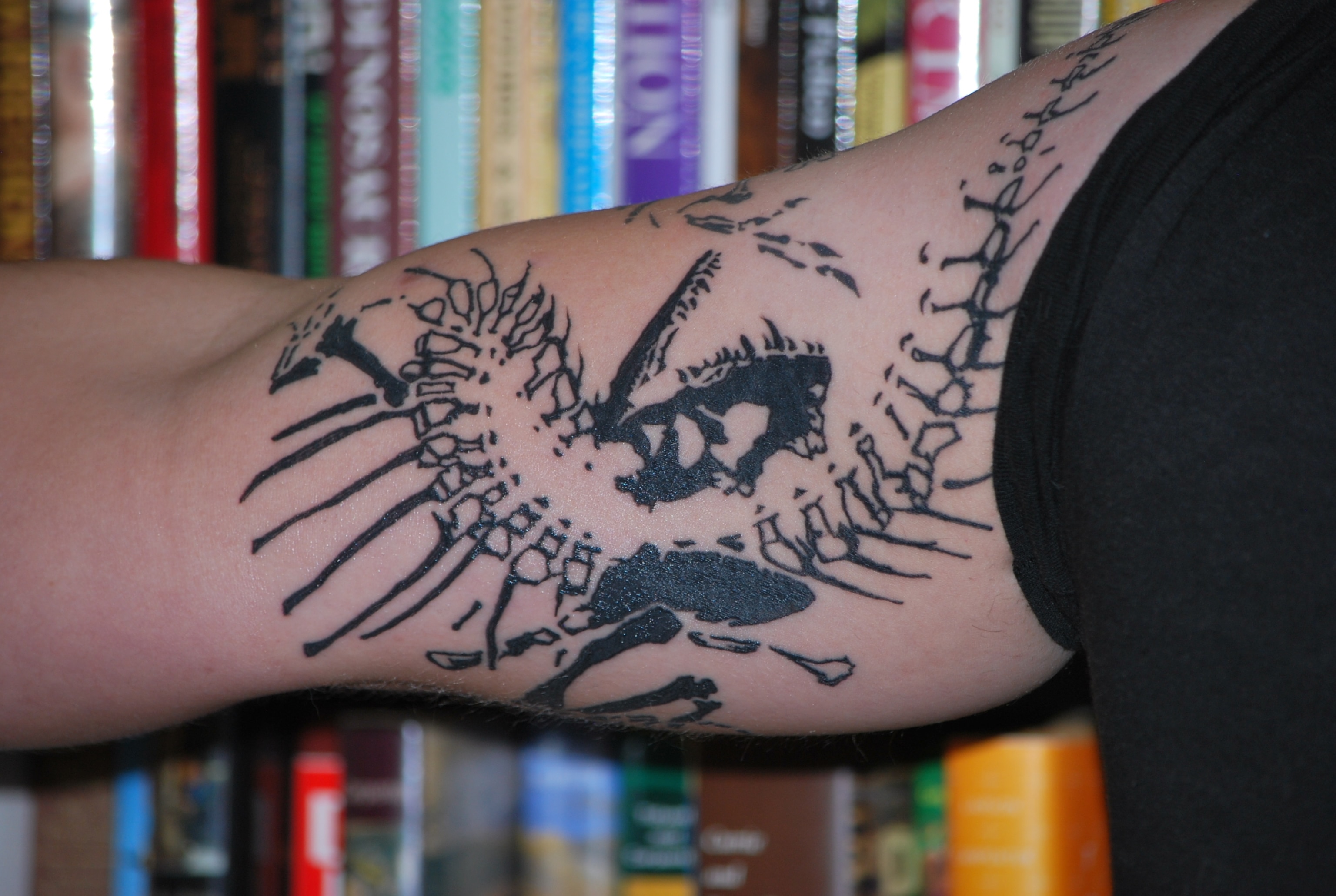 [I’m indebted to Glendon Mellow for drawing the Ceratosaurus skeleton, and Jon McAffee at Heart of Gold Tattoo for applying the ink. Now to decide which member of the Morrisson Formation cast is going to join my collection next.]