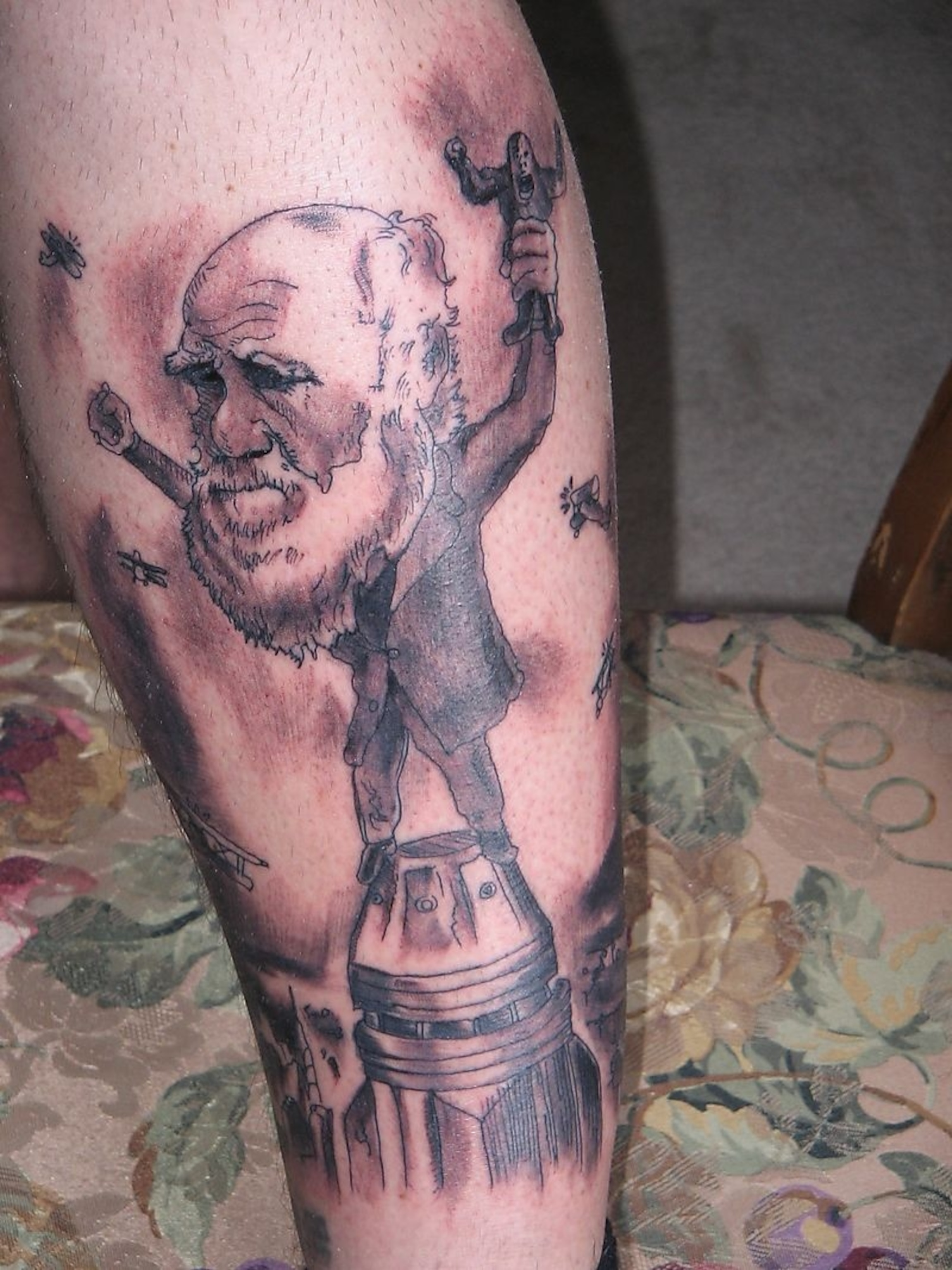 Chris writes, “I teach science at a public school in eastern Mass. This tattoo was taken from a New Yorker cartoon that my wife and I both have hanging in our classroom’s (she teaches science, too). Most people think it’s her Dad…there is a resemblance. When told it’s Charles Darwin, too many people reply, “Who’s Charles Darwin?”. It’s kind of sad. I call this Darwin Kong, the establishment trying to destroy Darwin for the same reason it destroyed Kong, it just didn’t understand him.”
